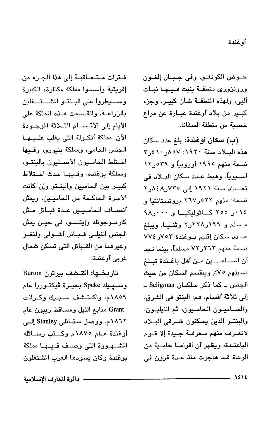 (ب) سكان أوغندة: بلغ عدد سكان هذه البلاد سنة 1920: 3.410.857 نسمة منهم 1995 أوروبيا و 12.539 آسيويا. وهبط عدد سكان البلاد في تعداد سنة 1921 إلى 2.848.735 نسمة؛ منهم 267.522 بروتستانتيا و 255.014 كاثوليكيا و 98.000 مسلم و 2.228.199 وثنيا. ويبلغ عدد سكان إقليم بوغندة 774.753 نسمة منهم 72.263 مسلمًا، بينما نجد أن المسلمين من أهل باغندة تبلغ نسبتهم 75 % وينقسم السكان من حيث الجنس -كما ذكر سلكمان Seligman - إلى ثلاثة أقسام، هم: البنتو في الشرق، والساميون الحاميون، ثم النيليون، والبنتو الذين يسكنون شرقي البلاد لا نعرف منهم معرفة جيدة إلا قوم الباغندة، ويظهر أن أقواما حامية من الرعاة قد هاجرت منذ عدة قرون في فترات متعاقبة إلى هذا الجزء من إفريقية وأسسوا مملكة "كتارة" الكبيرة وسيطروا على البنتو المشتغلين بالزراعة، وانقسمت هذه المملكة على الأيام إلى الأقسام الثلاثة الموجودة الآن: مملكة أنكولة التي يغلب عليها الجنس الحامى، ومملكة بنيورو، وفيها اختلط الحاميون الأصليون بالبنتو، ومملكة بوغنده، وفيها حدث اختلاط كبير بين الحاميين والبنتو وإن كانت الأسرة الحاكمة من الحاميين. ويمثل أنصاف الحاميين عدة قبائل مثل كارموجونك وإيتسو، في حين يمثل الجنس النيلى قبائل أشولى ولنغو وغيرهما من القبائل التي تسكن شمال غربي أوغندة.
