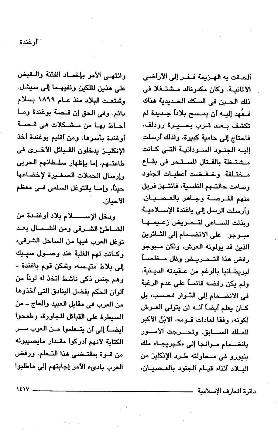 ألحقت به الهزيمة ففر إلى الأراضي الألمانية. وكان مكدونالد مشتغلًا في ذلك العين في السكك الحديدية هناك فعُهد إليه أن يمسح بلادا جديدة لم تكشف بعد قرب بحيرة رودلف، فاحتاج إلى حامية كبيرة، ولذلك أرسلت إليه الجنود السودانية التي كانت مشتغلة بالقتال المستمر في بقاع مختلفة. وخفضت أعطيات الجنود وساءت حالتهم النفسية، فانتهز فريق منهم الفرصة وجاهر بالعصيان. وأرسلت الرسل إلى باغندة الإِسلامية وبذلت المساعى لتحريض زعيمها مبوجو على الانضمام إلى الثائرين الذين قد يولونه العرش، ولكن مبوجو رفض هذا التحريض وظل مخلصا لبريطانيا بالرغم من عقيدته الدينية. ولم يكن رفضه قائما على عدم الرغبة في الانضمام إلى الثوار فحسب، بل كان يعلم أيضًا أنه لن يتولى العرش لكونه، وفقا لعادات قومه، الابن الأكبر للملك السابق. وتحرجت الأمور بانضمام موانجا إلى "كبريجا" ملك بنيورو في محاولته طرد الإنكليز من البلاد أثناء قيام الجنود بالعصيان، وانتهى الأمر بإخماد الفتنة والقبض على هذين الملكين ونفيهما إلى سيشل. وتمتعت البلاد منذ عام 1899 بسلام دائم. وفي الحق أن قصة بوغندة وما أحاط بها من مشكلات هي قصة أوغندة بأسرها. ومن أقليم بوغندة أخذ الإنكليز يدخلون القبائل الأخرى في طاعتهم، إما بإظهار سلطانهم الحربي وإرسال الحملات الصغيرة لاخضاعها حينا، وإما بالتوغل السلمى في معظم الأحيان.