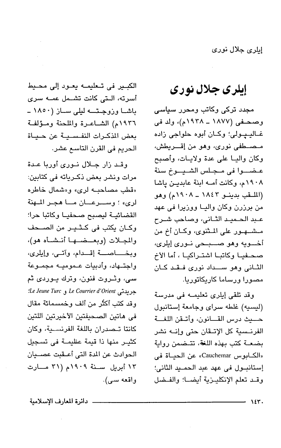 مجدد تركى وكاتب ومحرر سياسى وصحفى (1877 - 1938 م)، ولد في غاليبولى؛ وكان أبوه حلواجى زاده مصطفى نورى, وهو من إقريطش، وكان واليا على عدة ولايات، وأصبح عضوا في مجلس الشيوخ سنة 1908 م، وكانت أمه ابنة عابدين باشا (الملقب بدينو 1843 - 1908) وهو من برزرن وكان واليا ووزيرا في عهد عبد الحميد الثاني، وصاحب شرح مشهور على المثنوى، وكان أخ من أخويه وهو صبحى نورى إيلرى، صحفيا وكاتبا اشتراكيا، أما الأخ الثاني وهو سداد نورى فقد كان مصورا ورساما كاريكاتوريا.