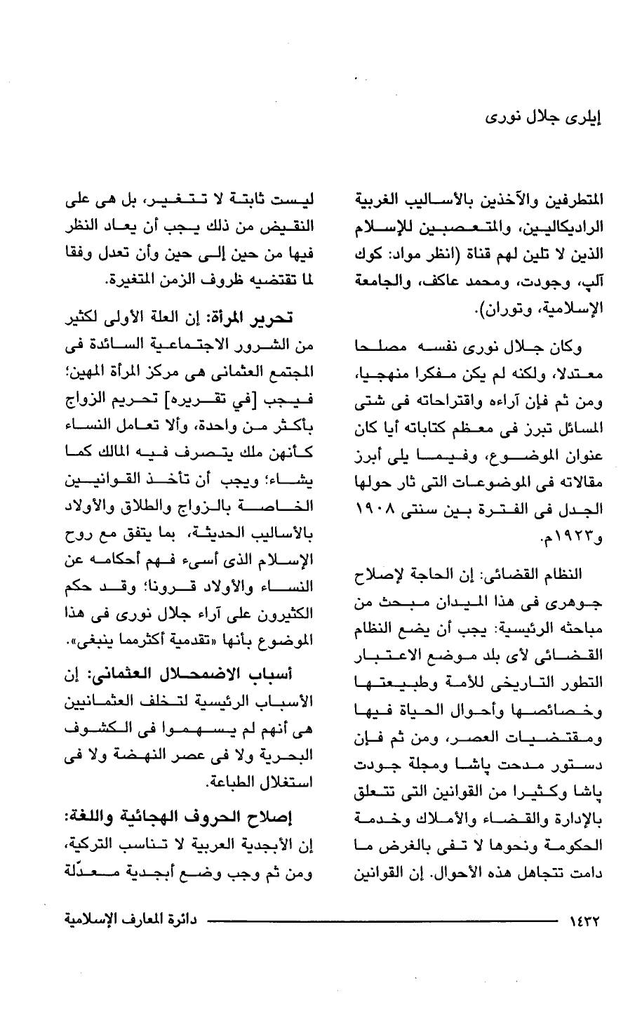تحرير المرأة: إن العلة الأولى لكثير من الشرور الاجتماعية السائدة في المجتمع العثمانى هي مركز المرأة المهين؛ فيجب [في تقريره] تحريم الزواج بأكثر من واحدة، وألا تعامل النساء كأنهن ملك يتصرف فيه المالك كما يشاء؛ ويجب أن تأخذ القوانيين الخاصة بالزواج والطلاق والأولاد بالأساليب الحديثة، بما يتفق مع روح الإسلام الذي أسئ فهم أحكامه عن النساء والأولاد قرونا؛ وقد حكم الكثيرون على آراء جلال نورى في هذا الموضوع بأنها "تقدمية أكثر مما ينبغي".