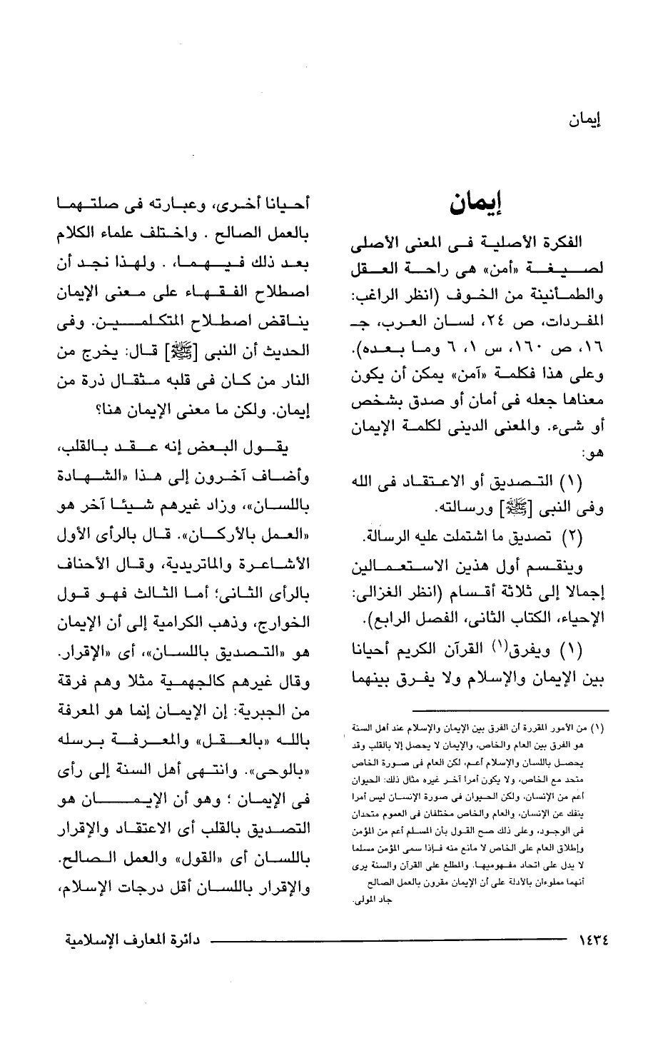 (1) ويفرق (¬1) القرآن الكريم أحيانا بين الإيمان والإِسلام ولا يفرق بينهما أحيانا أخرى، وعبارته في صلتهما بالعمل الصالح. واختلف علماء الكلام بعد ذلك فيهما, ولهذا نجد أن اصطلاح الفقهاء على معنى الإيمان يناقض اصطلاح المتكلمين. وفي الحديث أن النبي [- صلى الله عليه وسلم -] قال: يخرج من النار من كان في قلبه مثقال ذرة من إيمان. ولكن ما معنى الإيمان هنا؟