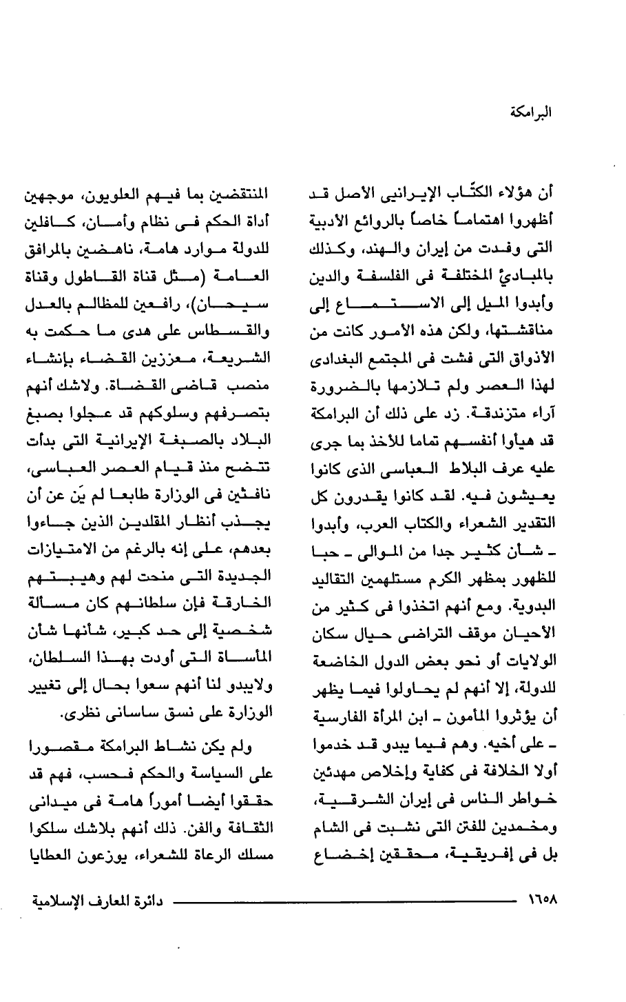 أن هؤلاء الكتّاب الإيرانيى الأصل قد أظهروا اهتمامًا خاصًّا بالروائع الأدبية التي وفدت من إيران والهند، وكذلك بالمباديء المختلفة في الفلسفة والدين وأبدوا الميل إلى الاستماع إلى مناقشتها, ولكن هذه الأمور كانت من الأذواق التي فشت في المجتمع البغدادي لهذا العصر ولم تلازمها بالضرورة آراء متزندقة. زد على ذلك أن البرامكة قد هيأوا أنفسهم تماما للأخذ بما جرى عليه عرف البلاط العباسى الذي كانوا يعيشون فيه. لقد كانوا يقدرون كل التقدير الشعراء والكتاب العرب، وأبدوا -شأن كثير جدًّا من الموالى- حبا للظهور بمظهر الكرم مستلهمين التقاليد البدوية. ومع أنهم اتخذوا في كثير من الأحيان موقف التراضى حيال سكان الولايات أو نحو بعض الدول الخاضعة للدولة، إلا أنهم لم يحاولوا فيما يظهر أن يؤثروا المأمون -ابن المرأة الفارسية- على أخيه. وهم فيما يبدو قد خدموا أولًا الخلافة في كفاية وإخلاص مهدئين خواطر الناس في إيران الشرقية، ومخمدين للفتن التي نشبت في الشام بل في إفريقية، محققين إخضاع المنتقضين بما فيهم العلويون، موجهين أداة الحكم في نظام وأمان، كافلين للدولة موارد هامة، ناهضين بالمرافق العامة (مثل قناة القاطول وقناة سيحان)، رافعين للمظالم بالعدل والقسطاس على هدى ما حكمت به الشريعة، معززين القضاء بإنشاء منصب قاضي القضاة. ولا شك أنهم بتصرفهم وسلوكهم قد عجلوا بصبغ البلاد بالصبغة الإيرانية التي بدأت تتضح منذ قيام العصر العباسى، نافثين في الوزارة طابعا لم يَن عن أن يجذب أنظار المقلدين الذين جاءوا بعدهم، على إنه بالرغم من الامتيازات الجديدة التي منحت لهم وهيبتهم الخارقة فإن سلطانهم كان مسألة شخصية إلى حد كبير، شأنها شأن المأساة التي أودت بهذا السلطان، ولا يبدو لنا أنهم سعوا بحال إلى تغيير الوزارة على نسق ساسانى نظرى.