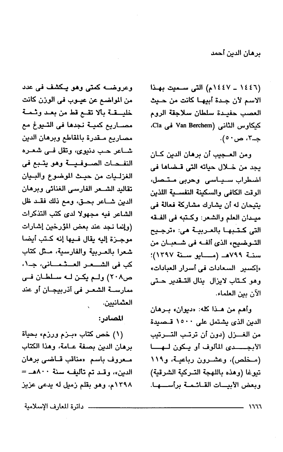 (1) خص كتاب "بزم ورزم" بحياة برهان الدين بصفة عامة، وهذا الكتاب معروف باسم "مناقب قاضى برهان الدين"، وقد تم تأليفه سنة 800 هـ = 1398 م، وهو بقلم زميل له يدعى عزيز