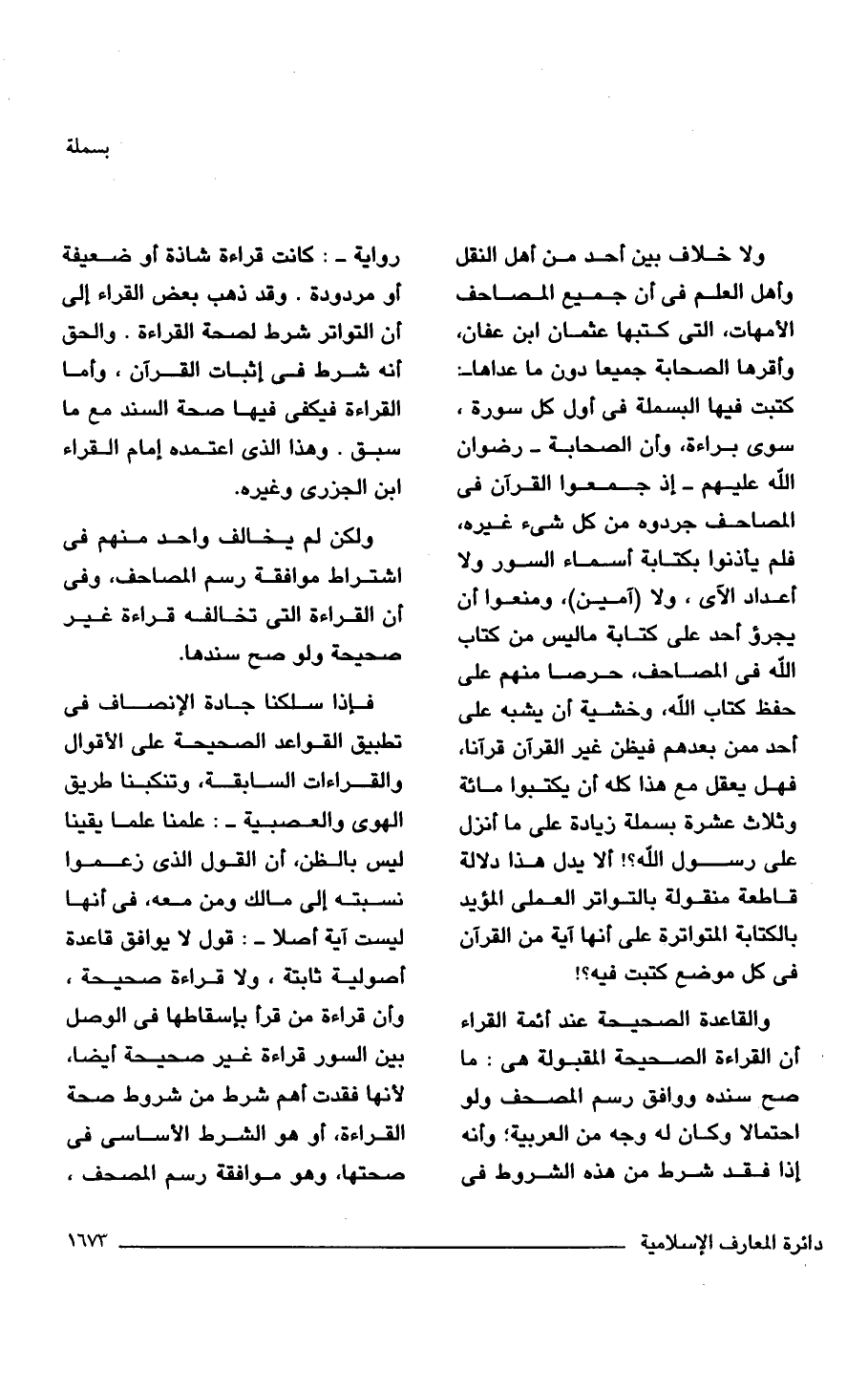 ولا خلاف بين أحد من أهل النقل وأهل العلم في أن جميع المصاحف الأمهات، التي كتبها عثمان ابن عفان، وأقرها الصحابة جميعًا دون ما عداها -: كتبت فيها البسملة في أول كل سورة، سوى براءة، وأن الصحابة -رضوان الله عليهم- إذ جمعوا القرآن في المصاحف جردوه من كل شيء غيره، فلم يأذنوا بكتابة أسماء السور ولا أعداد الآى، ولا (آمين)، ومنعوا أن يجرؤ أحد على كتابة ما ليس من كتاب الله في المصاحف، حرصا منهم على حفظ كتاب الله، وخشية أن يشبه على أحد ممن بعدهم فيظن غير القرآن قرآنا، فهل يعقل مع هذا كله أن يكتبوا مائة وثلاث عشرة بسملة زيادة على ما أنزل على رسول الله؟ ! ألا يدل هذا دلالة قاطعة منقولة بالتواتر العملى المؤيد بالكتابة المتواترة على أنها آية من القرآن في كل موضع كتبت فيه؟ !