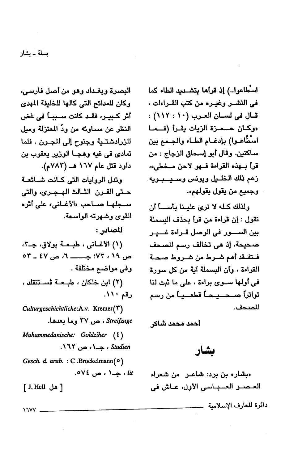 " بشار" بن برد: شاعر من شعراء العصر العباسى الأول، عاش في البصرة وبغداد وهو من أصل فارسى، وكان للمدائح التي كالها للخليفة المهدي أثر كبير، فقد كانت سببًا في غض النظر عن مساوئه من ودّ المعتزلة وميل للزرادشتية وجنوح إلى المجنون. فلما تمادى في غيه وهجا الوزير يعقوب بن داود قتل عام 167 هـ (783 م).