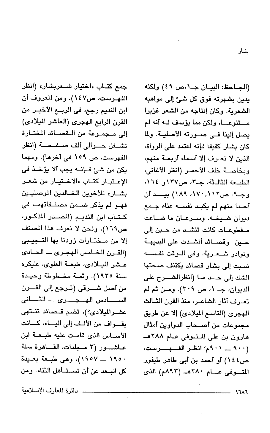 (الجاحظ: البيان جـ 1، ص 49) ولكنه يدين بشهرته فوق كل شيء إلى مواهبه الشعرية. وكان إنتاجه من الشعر غزيرا متنوعا, ولكن مما يؤسف له أنه لم يصل إلينا في صورته الأصلية. ولما كان بشار كفيفا فإنه اعتمد على الرواة، الذين لا نعرف إلا أسماء أربعة منهم، وبخاصة خلف الأحمر (انظر الأغانى، الطبعة الثالثة، جـ 3، ص 137 و 164, وجـ 9، ص 189, 170, 112) بيد أن أحدا منهم لم يكبد نفسه عناء جمع ديوان شيخه. وسرعان ما ضاعت مقطوعات كانت تنشد من حين إلى حين وقصائد أنشدت على البديهة ونوادر شعرية، وفي الوقت نفسه نسبت إلى بشار قصائد يكتنف صحتها الشك إلى حد ما (انظر الشرح على الديوان، جـ 1، ص 309). ومن ثم لم تعرف آثار الشاعر، منذ القرن الثالث الهجري (التاسع الميلادي) إلا عن طريق مجموعات من أصحاب الدواوين أمثال هارون بن علي المتوفى عام 288 هـ - (900 - 901 م؛ انظر الفهرست، ص 144) أو أحمد بن أبي طاهر طيفور المتوفى عام 380 هـ (893 م) الذي جمع كتاب "اختيار شعر بشار" (انظر الفهرست، ص 147). ومن المعروف أن ابن النديم رجع، في الربع الأخير من القرن الرابع الهجري (العاشر الميلادي) إلى مجموعة من القصائد المختارة تشغل حوالي ألف صفحة (انظر الفهرست، ص 159 في آخرها). ومهما يكن من شيء فإنه يجب ألا يؤخذ في الإعتبار كتاب "الاختيار من شعر بشار" للأخوين الخالدين الموصليين فهو لم يذكر ضمن مصنفاتهما في كتاب ابن النديم (المصدر المذكور، ص 169) , ونحن لا نعرف هذا المصنف إلا من مختارات زودنا بها التجيبى (القرن الخامس الهجري - الحادي عشر الميلادي، طبعة العلوى، عليكره سنة 1935). وثمة مخطوطة وحيدة من أصل شرقي (ترجع إلى القرن السادس الهجري - الثاني عشر الميلادى؟ )، تضم قصائد تنتهي بقواف من الألف إلى الياء، كانت الأساس الذي قامت عليه طبعة ابن عاشور (3 مجلدات، القاهرة سنة 1950 - 1957)، وهي طبعة بعيدة كل البعد عن أن تستأهل الثناء. ومن