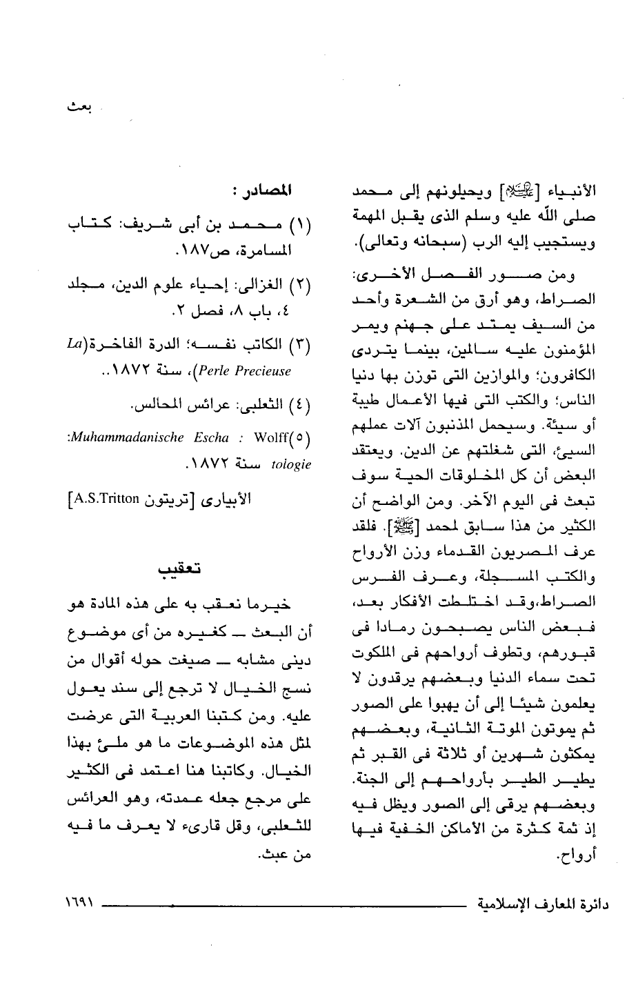 خير ما نعقب به على هذه المادة هو أن البعث -كغيره من أي موضوع دينى مشابه- صيغت حوله أقوال من نسج الخيال لا ترجع إلى سند يعول عليه. ومن كتبنا العربية التي عرضت لمثل هذه الموضوعات ما هو ملئ بهذا الخيال. وكاتبنا هنا اعتمد في الكثير على مرجع جعله عمدته، وهو العرائس للثعلبى، وقل قارئ لا يعرف ما فيه من عبث.