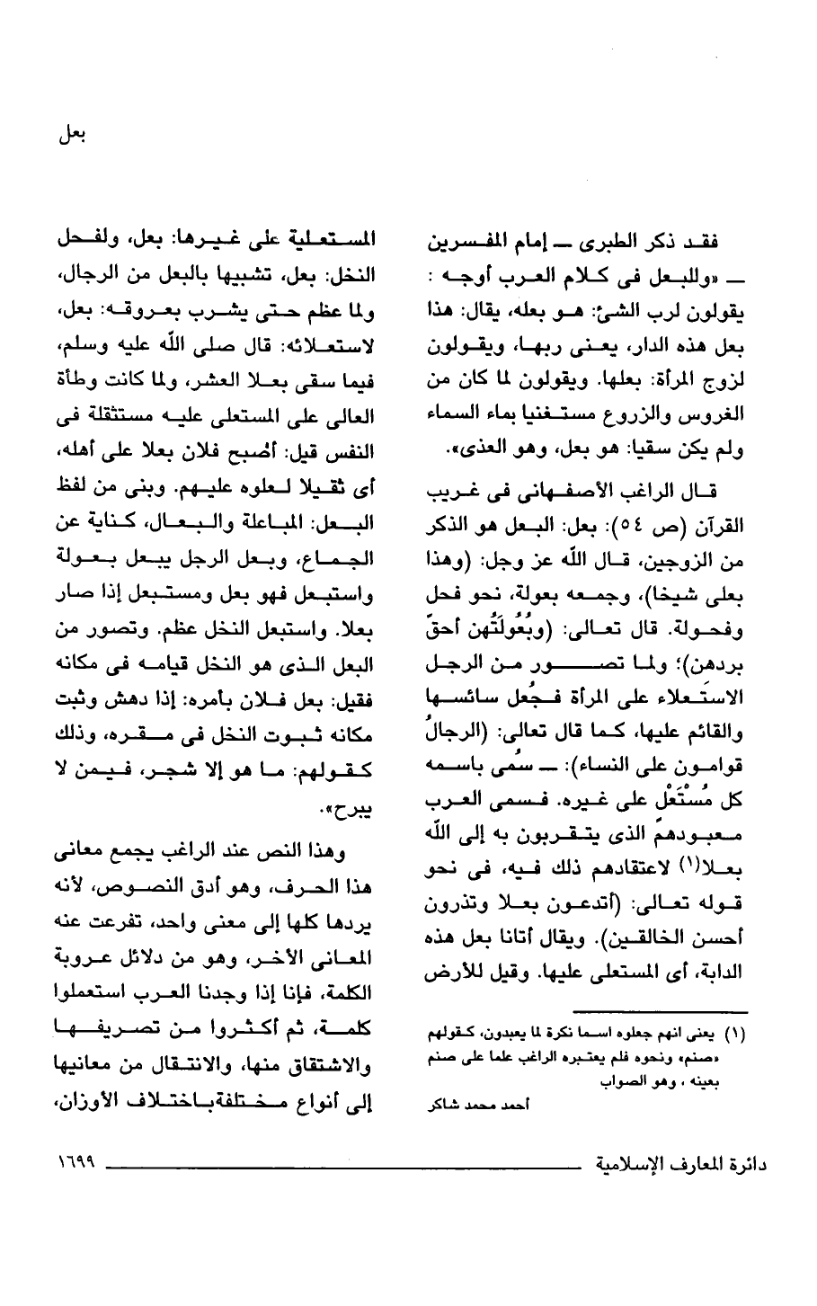 قال الراغب الأصفهانى في غريب القرآن (ص 54): بعل: البعل هو الذكر من الزوجين، قال الله عزَّ وجلَّ: (وهذا بعلى شيخا)، وجمعه بعولة، نحو فحل وفحولة. قال تعالى: {وبُعُولَتُهن أحقُّ بردهِن}؛ ولما تصور من الرجل الاستعلاء على المرأة فجُعل سائسها والقائم عليها، كما قال تعالى: (الرجالُ قوامون على النساء): - سُمى باسمه كل مُسْتَعْلٍ على غيره. فسمى العرب معبودهم الذي يتقربون به إلى الله بعلا (¬1) لاعتقادهم ذلك فيه، في نحو قوله تعالى: {أتدعون بعلا وتذرون أحسن الخالقين}. ويقال أتانا بعل هذه الدابة، أي المستعلى عليها. وقيل للأرض المستعلية على غيرها: بعل، ولفحل النخل: بعل، تشبيها بالبعل من الرجال، ولما عظم حتى يشرب بعروقه: بعل، لاستعلائه: قال صلى الله عليه وسلم، فيما سقى بعلا العشر، ولما كانت وطأة العالى على المستعلى عليه مستثقلة في النفس قيل: أصبح فلان بعلا على أهله، أي ثقيلا لعلوه عليهم. وبنى من لفظ البعل: المباعلة والبعال، كناية عن الجماع، وبعل الرجل يبعل بعولة واستبعل فهو بعل ومستبعل إذا صار بعلا. واستبعل النخل عظم. وتصور من البعل الذي هو النخل قيامه في مكانه فقيل: بعل فلان بأمره: إذا دهش وثبت مكانه ثبوت النخل في مقره، وذلك كقولهم: ما هو إلا شجر، فيمن لا يبرح".