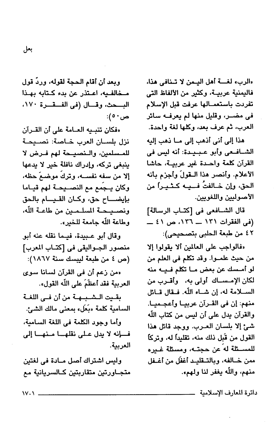 هذا إلى أنى أدهب إلى ما ذهب إليه الشافعي وأبو عبيدة: أنه ليس في القرآن كلمة واحدة غير عربية، حاشا الأعلام. وانصر هذا القولَ وأجزم بأنه الحق، وإن خالفتُ فيه كثيرًا من الأصوليين واللغويين.