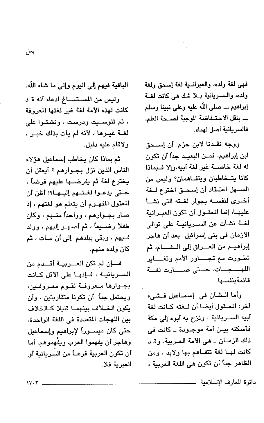 ووجه نقدنا لابن حزم: أن إسحاق بن إبراهيم، فمن البعيد جدا أن تكون له لغة خاصة غير لغة أبيه، وإلا فبماذا كانا يتخاطبان ويتفاهمان؟ وليس من السهل اعتقاد أن إسحاق اخترع لغة أخرى لنفسه بجوار لغته التي نشأ عليها، إنما المعقول أن تكون العبرانية لغة نشات عن السريانية على توالى الأزمان في بني إسرائيل بعد أن هاجر إبراهيم من العراق إلى الشام، ثم تطورت مع تجاور الأمم وتغاير اللهجات، حتى صارت لغة قائمة بنفسها.