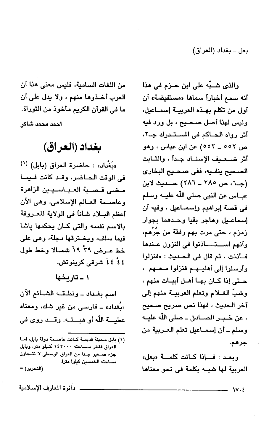 " بَغْداد": حاضرة العراق (بابل) (¬1) في الوقت الحاضر، وقد كانت فيما مضى قصبة العباسيين الزاهرة وعاصمة العالم الإسلامي، وهي الآن أعظم البلاد شأنًا في الولاية المعروفة بالاسم نفسه والتي كان يحكمها باشا فيما سلف، ويخترقها دجلة، وهي على خط عرض 39 ْ 19 َ شمالا وخط طول 44 ْ 44 َ شرقي كرينوتش.