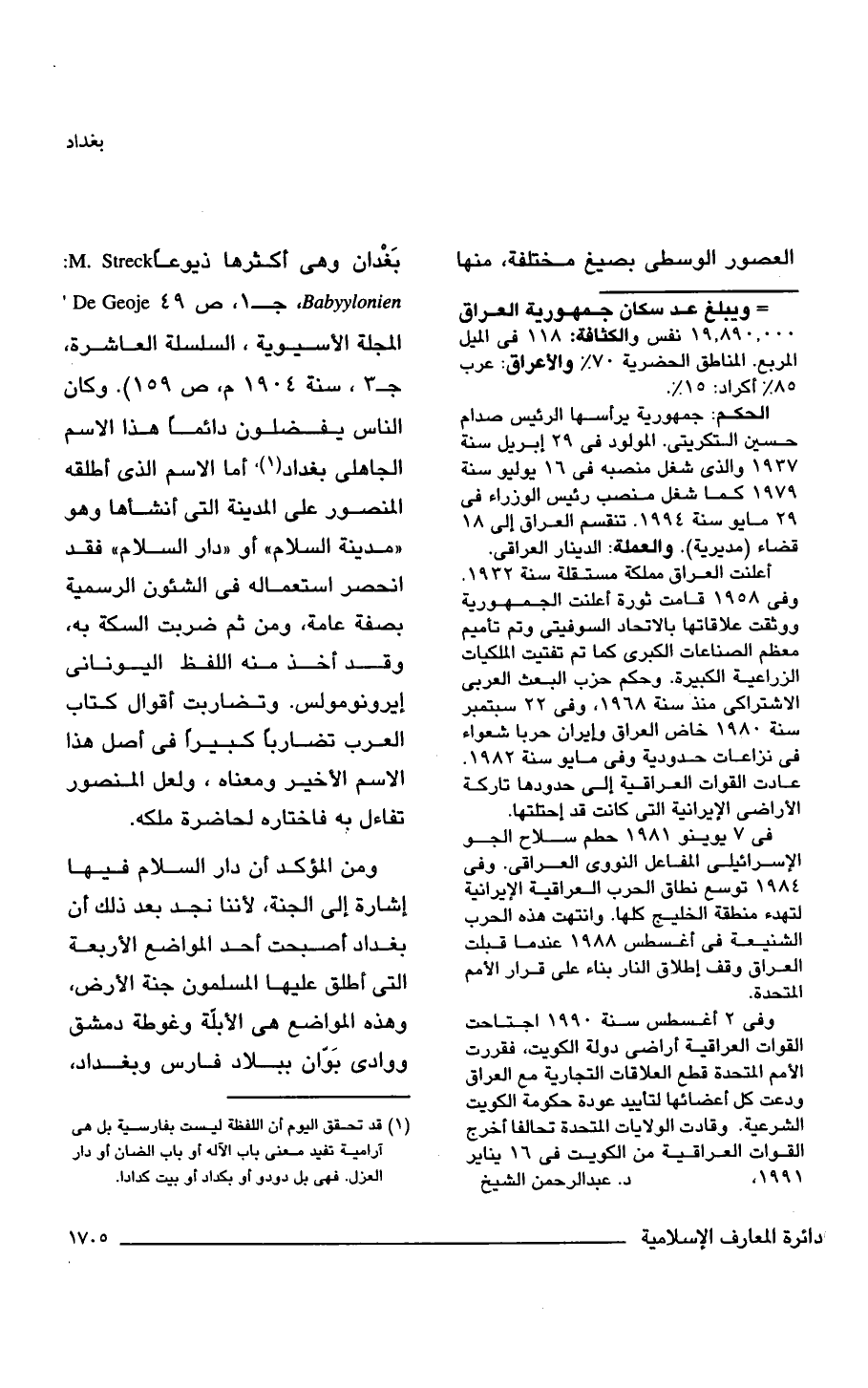 = ويبلغ عد سكان جمهورية العراق 19.890.000 نفس والكثافة: 118 في الميل المربع. المناطق الحضرية 70 % والأعراق: عرب 85 % أكراد: 15 %.