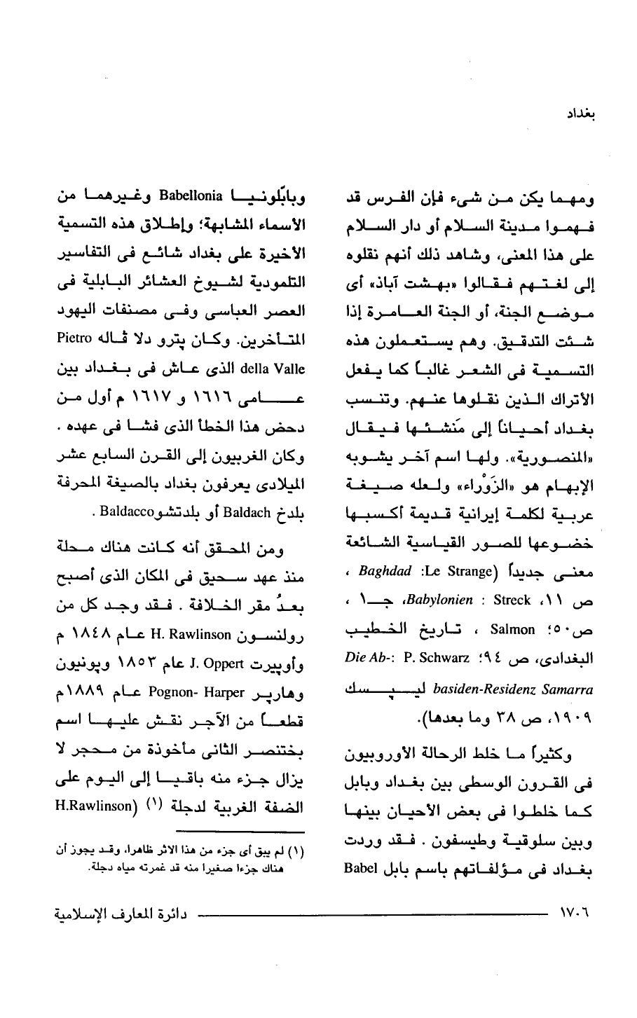 ومهما يكن من شيء فإن الفرس قد فهموا مدينة السلام أو دار السلام على هذا المعنى، وشاهد ذلك أنهم نقلوه إلى لغتهم فقالوا "بهشت آباذ" أي موضع الجنة، أو الجنة العامرة إذا شئت التدقيق. وهم يستعملون هذه التسمية في الشعر غالبا كما يفعل الأتراك الذين نقلوها عنهم. وتنسب بغداد أحيانا إلى مَنشئها فيقال "المنصورية". ولها اسم آخر يشوبه الإبهام هو "الزَوْراء" ولعله صيغة عربية لكلمة إيرانية قديمة أكسبها خضوعها للصور القياسية الشائعة معنى جديدًا Baghdad: Le Strange) . ص 11، Babylonien: Streck، جـ 1، ص 50؛ Salmon، تاريخ الخطيب البغدادي، ص 94؛ Die Ab-: P. Schwarz basiden-Residenz Samarra ليبسك 1909، ص 38 وما بعدها).