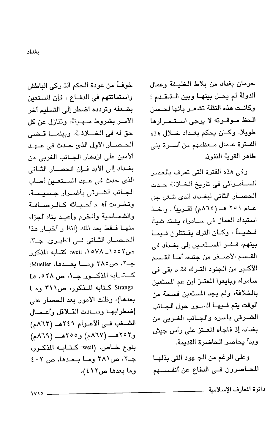 وعلى الرغم من الجهود التي بذلها المحاصرون في الدفاع عن أنفسهم خوفًا من عودة الحكم التركى الباطش واستماتتهم في الدفاع، فإن المستعين بضعفه وتردده اضطر إلى التسليم آخر الأمر بشروط مهينة، وتنازل عن كل حق له في الحلافة. وبينما قضى الحصار الأول الذي حدث في عهد الأمين على ادهار الجانب الغربي من بغداد إلى الأبد فإن الحصار الثاني الذي حدث في عهد المستعين أصاب الجانب الشرقي بأضرار جسيمة، وتخربت أهم أحيائه كالرصافة والشماسية والمخرم وأعيد بناء أجزاء منها فقط بعد ذلك (انظر أخبار هذا الحصار الثاني في الطبري، جـ 3، ص 1553 - 1578، weil: كتابه المذكور جـ 2، ص 385 وما بعدها، Mueller: كتابه المذكور جـ 1، ص 528، Le Strange كتابه المذكور، ص 311 وما بعدها)، وظلت الأمور بعد الحصار على اضطرابها وسادت القلاقل وأعمال الشغب في الأعوام 249 هـ (863 م) و 253 هـ (867 م) و 255 هـ (869 م) بنوع خاص. (Weil: كتابه المذكور، جـ 2، ص 381 وما بعدها، ص 402 وما بعدها ص 412).