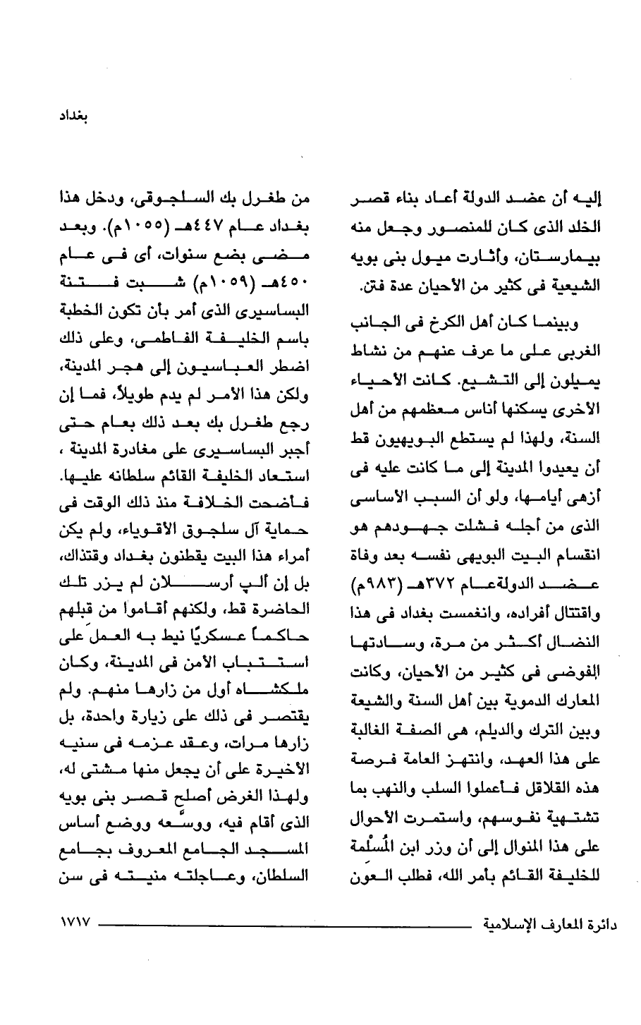 إليه أن عضد الدولة أعاد بناء قصر الخلد الذي كان للمنصور وجعل منه بيمارستان، وأثارت ميول بنى بويه الشيعية في كثير من الأحيان عدة فتن.