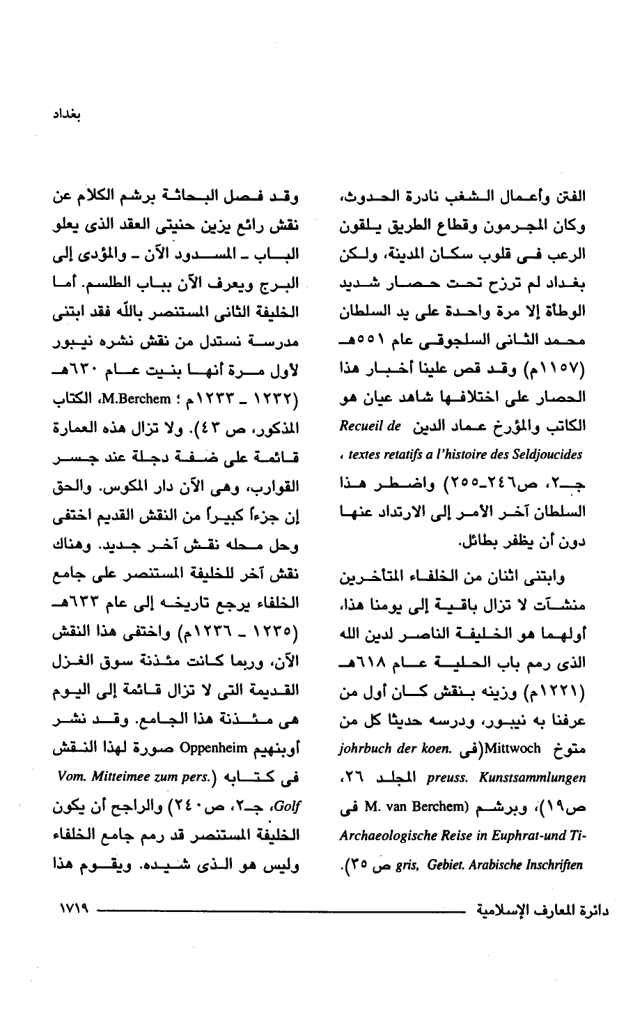 وقد فصل البحاثة برشم الكلام عن نقش رائع يزين حنيتى العقد الذي يعلو الباب -المسدود الآن- والمؤدى إلى البرج ويعرف الآن بباب الطلسم. أما الخليفة الثاني المستنصر بالله فقد ابتنى مدرسة نستدل من نقش نشره نيبور لأول مرة أنها بنيت عام 630 هـ (1232 - 1233 م؛ M.Berchem , الكتاب المذكور، ص 43). ولا تزال هذه العمارة قائمة على ضفة دجلة عند جسر القوارب، وهي الآن دار المكوس. والحق إن جزءًا كبيرًا من النقش القديم اختفى وحل محله نقش آخر جديد. وهناك نقش آخر للخليفة المستنصر على جامع الخلفاء يرجع تاريخه إلى عام 633 هـ (1235 - 1236 م) واختفى هذا النقش الآن، وربما كانت مئذنة سوق الغزل القديمة التي لا تزال قائمة إلى اليوم هي مئذنة هذا الجامع. وقد نشر أوبنهيم Oppenheim صورة لهذا النقش في كتابه (Vom. Mitteimee zum pers Golf، جـ 2، ص 240) والراجح أن يكون الخليفة المستنصر قد رمم جامع الخلفاء وليس هو الذي شيده. ويقوم هذا