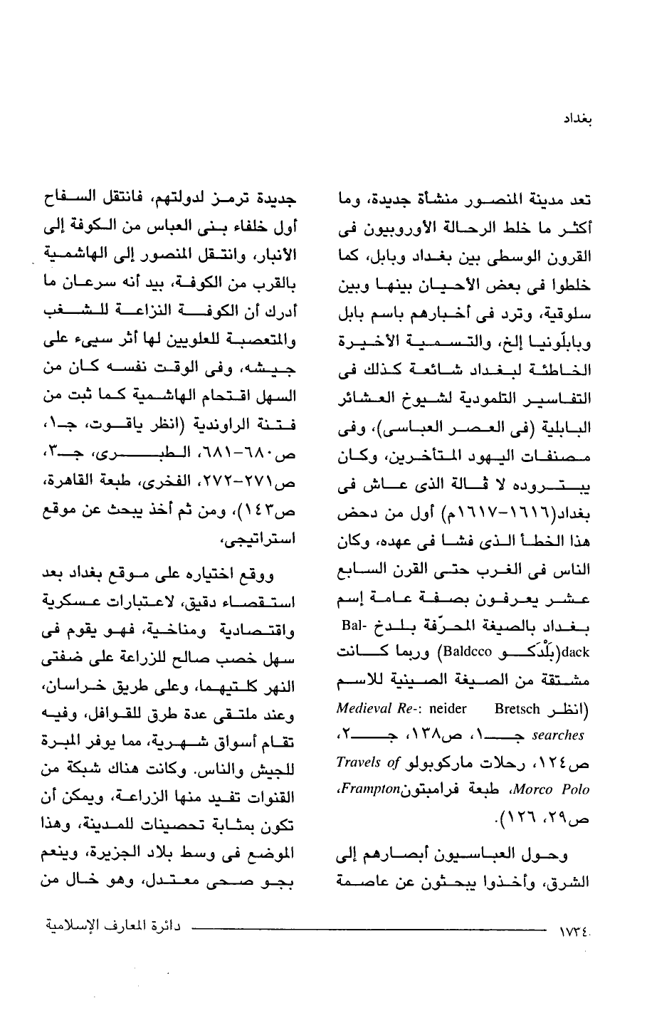 تعد مدينة المنصور منشأة جديدة، وما أكثر ما خلط الرحالة الأوربيون في القرون الوسطى بين بغداد وبابل، كما خلطوا في بعض الأحيان بينها وبين سلوقية، وترد في أخبارهم باسم بابل وبابلّونيا إلخ، والتسمية الأخيرة الخاطئة لبغداد شائعة كذلك في التفاسير التلمودية لشيوخ العشائر البابلية (في العصر العباسى)، وفي مصنفات اليهود المتأخرين، وكان يبتروده لا فالة الذي عاش في بغداد (1616 - 1617 م) أول من دحض هذا الخطأ الذي فشا في عهده، وكان الناس في الغرب حتى القرن السابع عشر يعرفون بصفة عامة اسم بغداد بالصيغة المحرّفة بلدخ - Bal dack (بَلْدَكو Baldcco) وربما كانت مشتقة من الصيغة الصينية للاسم (انظر Medieval Re-: neider Bretsch searches جـ 1، ص 138، جـ 2، ص 124، رحلات ماركوبولو Travels Morco Polo " طبعة فرامبتون Frampton, ص 29، 126).