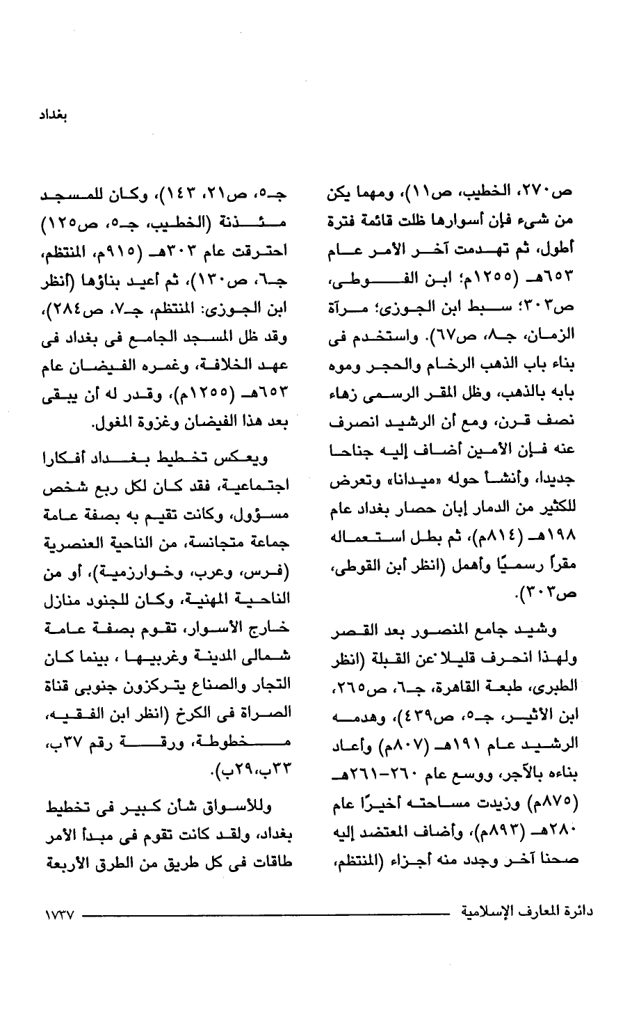 ويعكس تخطيط بغداد أفكارا اجتماعية، فقد كان لكل ربع شخص مسؤول، وكانت تقيم به بصفة عامة جماعة متجانسة، من الناحية العنصرية (فرس، وعرب، وخوارزمية)، أو من الناحية المهنية، وكان للجنود منازل خارج الأسوار، تقوم بصفة عامة شمالي المدينة وغربيها، بينما كان التجار والصناع يتركزون جنوبي قناة الصراة في الكرخ (انظر ابن الفقيه، مخطوطة، ورقة رقم 37 ب، 33 ب، 29 ب).