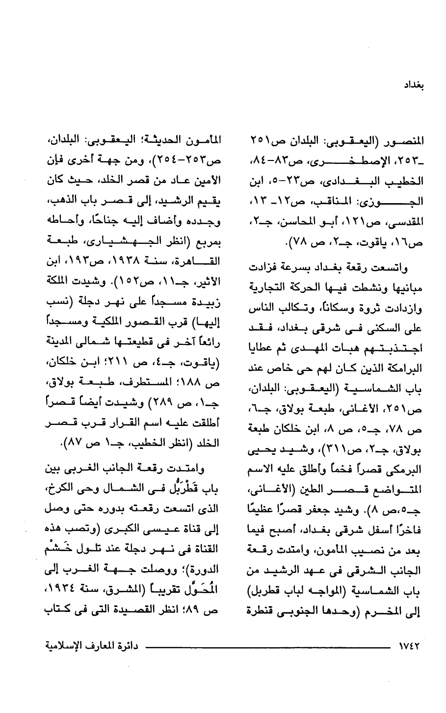 المنصور (اليعقوبى: البلدان ص 251 - 253 الإصطخري، ص 83 - 84، الخطيب البغدادي، ص 23 - 5، ابن الجوزي: المناقب، ص 12 - 13، المقدسي، ص 121، أبو المحاسن، جـ 2، ص 16، ياقوت، جـ 2، ص 78).