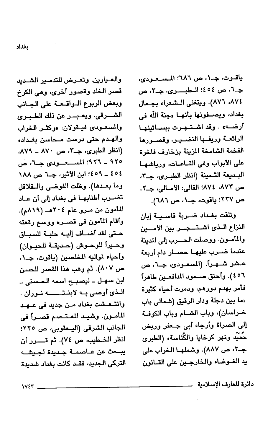 ياقوت، جـ 1، ص 686؛ المسعودى، جـ 6، ص 454؛ الطبري، جـ 3، ص 874، 876). ويتغنى الشعراء بجمال بغداد، ويصفونها بأنها "جنة الله في أرضه". وقد اشتهرت ببساتينها الرائعة وريفها النضير، وقصورها الفخمة الشامخة المزينة بزخارف فاخرة على الأبواب وفي القاعات، ورياشها البديعة الثمينة (انظر الطبري، جـ 3، ص 873، 874؛ القال: الأمالى، جـ 2، ص 237؛ ياقوت، جـ 1، ص 686).