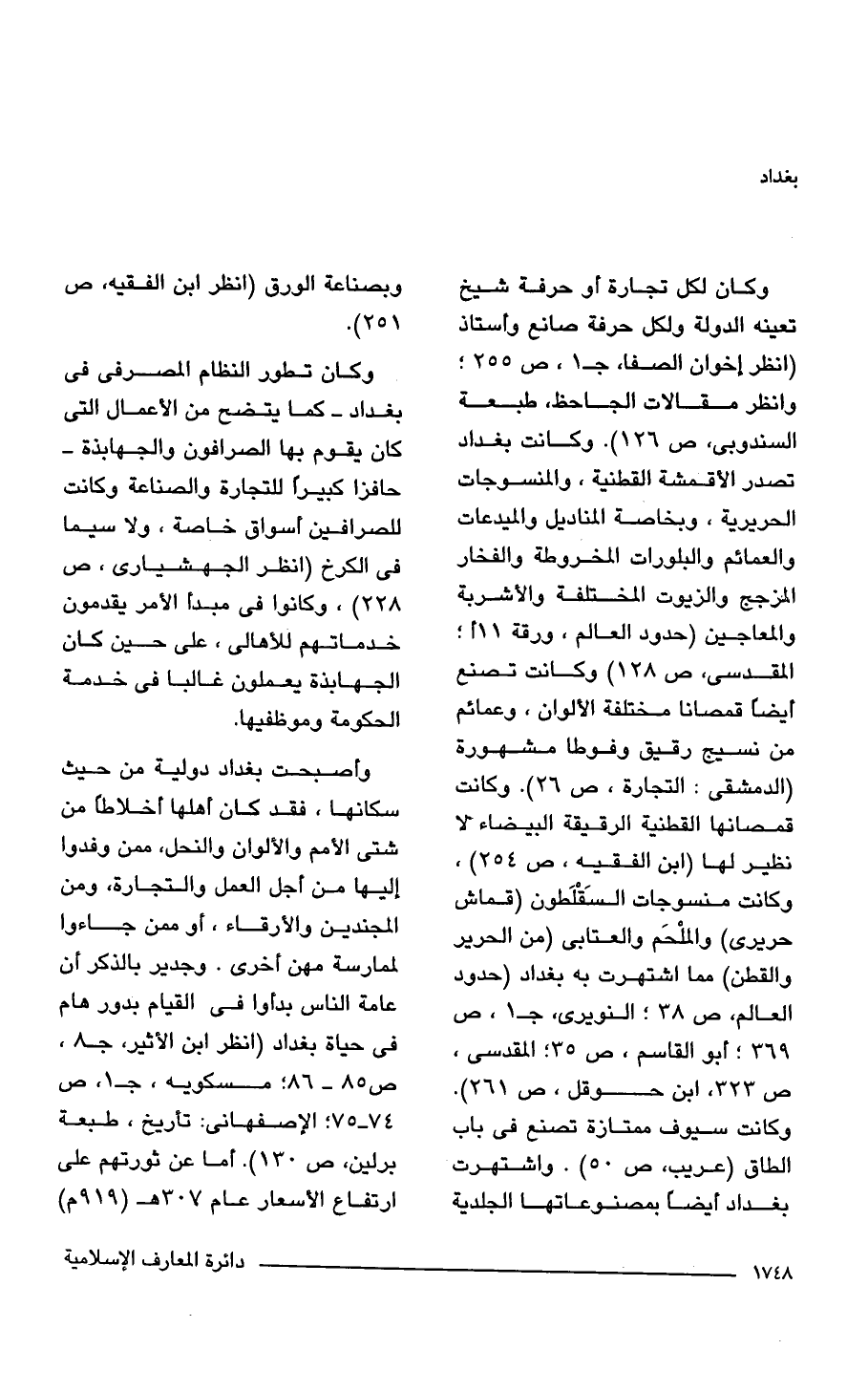 وكان لكل تجارة أو حرفة شيخ تعينه الدولة ولكل حرفة صانع وأستاذ (انظر إخوان الصفا، جـ 1، ص 255؛ وانظر مقالات الجاحظ، طبعة السندوبى، ص 126). وكانت بغداد تصدر الأقمشة القطنية، والمنسوجات الحريرية، وبخاصة المناديل والميدعات والعمائم والبلورات المخروطة والفخار المزجج والزيوت المختلفة والأشربة والمعاجين (حدود العالم، ورقة 11 أ؛ المقدسي، ص 128) كانت تصنع أيضًا قمصانا مختلفة الألوان، وعمائم من نسيج رقيق وفوطا مشهورة (الدمشقي: التجارة، ص 26). وكانت قمصانها القطنية الرقيقة البيضاء لا نظير لها (ابن الفقيه، ص 254)، وكانت منسوجات السَقْلَطون (قماش حريرى) والملْحَم والعتابى (من الحرير والقطن) هما اشتهرت به بغداد (حدود العالم، ص 38؛ النويرى، جـ 1، ص 369؛ أبو القاسم، ص 35؛ المقدسي، ص 323، ابن حوقل، ص 261). وكانت سيوف ممتازة تصنع في باب الطاق (عريب، ص 50). واشتهرت بغداد أيضًا بمصنوعاتها الجلدية وبصناعة الورق (انظر ابن الفقيه، ص 251).