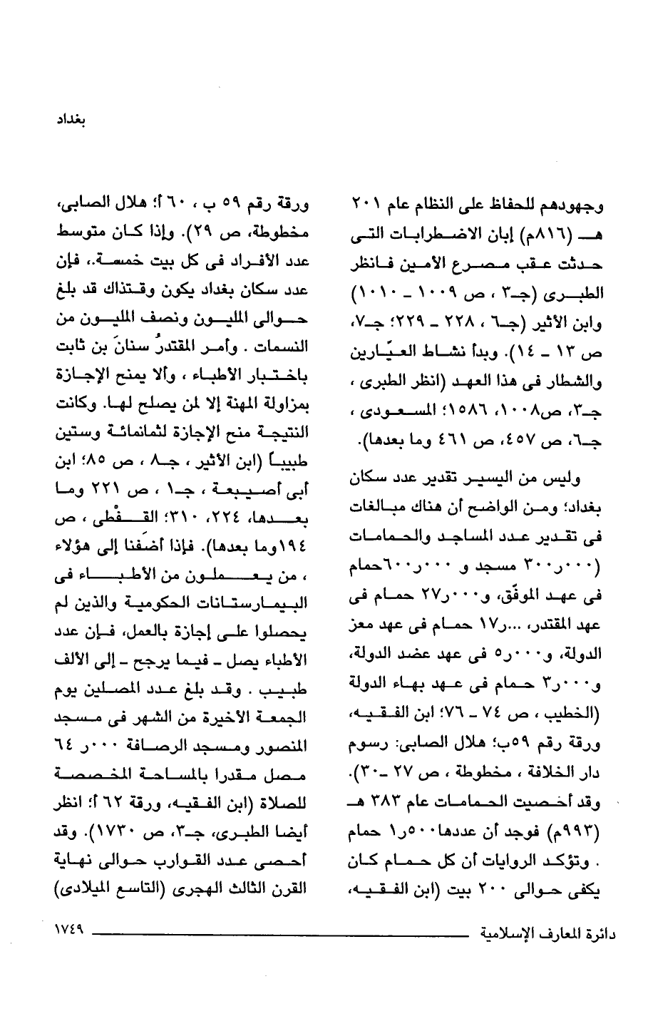وليس من اليسير تقدير عدد سكان بغداد؛ ومن الواضح أن هناك مبالغات في تقدير عدد المساجد والحمامات (300.000 مسجد و 600.000 حمام في عهد الموفّق، و 27.000 حمام في عهد المقتدر، 17.000 حمام في عهد معز الدولة، و 5.000 في عهد عضد الدولة، و 3.000 حمام في عهد بهاء الدولة (الخطيب، ص 74 - 76؛ ابن الفقيه، ورقة رقم 59 ب؛ هلال الصابى: رسوم دار الخلافة، مخطوطة، ص 27 - 30). وقد أخصيت الحمامات عام 383 هـ (993 م) فوجد أن عددها 1.500 حمام. وتؤكد الروايات أن كل حمام كان يكفى حوالي 300 بيت (ابن الفقيه، ورقة رقم 59 ب، 60 أ؛ هلال الصابى، مخطوطة، ص 29). وإذا كان متوسط عدد الأفراد في كل بيت خمسة، فإن عدد سكان بغداد يكون وقتذاك قد بلغ حوالي المليون ونصف المليون من النسمات. وأمر المقتدرُ سنانَ بن ثابت باختبار الأطباء، وألا يمنح الإجازة بمزاولة المهنة إلا لمن يصلح لها. وكانت النتيجة منح الإجازة لثمانمائة وستين طبيبًا (ابن الأثير، جـ 8 ص 85؛ ابن أبي أصيبعة، جـ 1، ص 221 وما بعدها , 224، 310؛ القفْطى، ص 149 وما بعدها). فإذا أضَفنا إلى هؤلاء، من يعملون من الأطباء في البيمارستانات الحكومية والذين لم يحصلوا على إجازة بالعمل، فإن عدد الأطباء يصل -فيما يرجح- إلى الألف طبيب. وقد بلغ عدد المصلين يوم الجمعة الأخيرة من الشهر في مسجد المنصور ومسجد الرصافة 64.000 مصل مقدرا بالمساحة المخصصة للصلاة (ابن الفقيه، ورقة 62 أ؛ انظر أيضًا الطبري، جـ 3، ص 1730). وقد أحصى عدد القوارب حوالي نهاية القرن الثالث الهجرى (التاسع الميلادي)