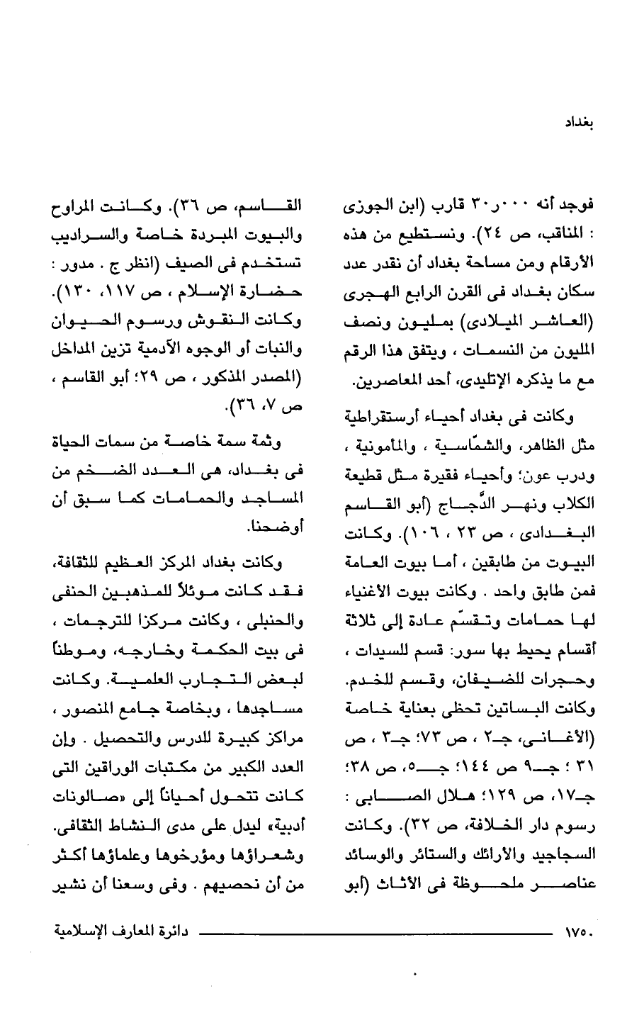فوجد أنه 30.000 قارب (ابن الجوزي: المناقب، ص 24). ونستطيع من هذه الأرقام ومن مساحة بغداد أن نقدر عدد سكان بغداد في القرن الرابع الهجرى (العاشر الميلادي) بمليون ونصف المليون من النسمات، ويتفق هذا الرقم مع ما يذكره الأتليدى، أحد المعاصرين.