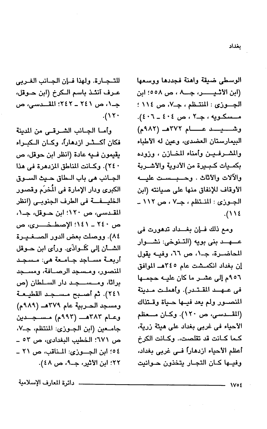 وأما الجانب الشرقي من المدينة فكان أكثر ازدهارًا، وكان الكبراء يقيمون فيه عادة (انظر ابن حوقل، ص 240). وكانت المناطق المزدهرة في هذا الجانب هي باب الطاق حيث السوق الكبرى ودار الإمارة في المُخرَم وقصور الخليفة في الطرف الجنوبي (انظر المقدسي، ص 120؛ ابن حوقل، جـ 1، ص 240 - 141؛ الإصطخر ى، ص 84). ووصلت بعض الدور الصغيرة الشأن إلى كلواذَى. ورأى ابن حوقل أربعة مساجد جامعة هي: مسجد المنصور، ومسجد الرصافة، ومسجد براثا، ومسجد دار السلطان (ص 241). ثم أصبح مسجد القطيعة ومسجد الحربية عام 379 هـ (989 م) وعام 383 هـ (993 م) مسجدين جامعين (ابن الجوزي: المنتظم، جـ 7، ص 671؛ الخطيب البغدادي، ص 53 - 54؛ ابن الجوزي: المناقب، ص 21 - 22؛ ابن الأثير، جـ 9، ص 48).