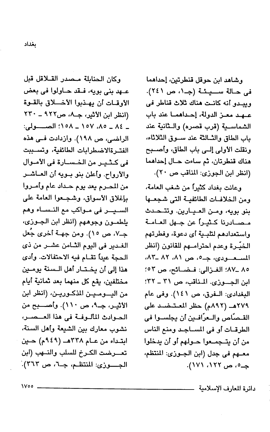 وكان الحنابلة مصدر القلاقل قبل عهد بنى بويه، فقد حاولوا في بعض الأوقات أن يهذبوا الأخلاق بالقوة (انظر ابن الأثير، جـ 8، ص 922 - 230 - 84 - 85، 157 - 158؛ الصولى: الراضى، ص 198). وازدادت في هذه الفترة الاضطرابات الطائفية، وتسببت في كثير من الخسارة في الأموال والأرواح. وأعلن بنو بويه أن العاشر من المحرم يعد يوم حداد عام وأمروا بإغلاق الأسواق، وشجعوا العامة على السير في مواكب مع النساء وهم يلطمون وجوههم (انظر ابن الجوزي، جـ 7، ص 15). ومن جهة أخرى جُعل الغدير في اليوم الثامن عشر من ذي الحجة عيدًا تقام فيه الاحتفالات. وأدى هذا إلى أن يختار أهل السنة يومين مختلفين، يقع كل منهما بعد ثمانية أيام من اليومين المذكورين، (انظر ابن الأثير، جـ 9، ص 110). وأصبح من الحوادث المألوفة في هذا العصر، نشوب معارك بين الشيعة وأهل السنة، ابتداء من عام 338 هـ (949 م) حين تعرضت الكرخ للسلب والنهب (ابن الجوزي: المنتظم، جـ 6، ص 363).