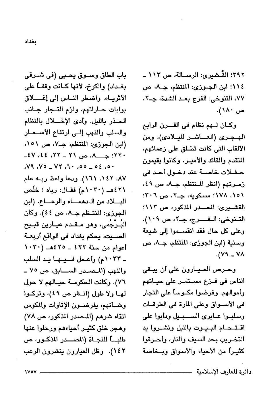 وحرص العيارون على أن يبقى الناس في فزع مستمر على حياتهم وأموالهم. وفرضوا مكوسًا على التجار في الأسواق وعلى المارة في الطرقات وسلبوا عابرى السبيل ودأبوا على اقتحام البيوت بالليل ونشروا يد التخريب بحد السيف والنار، وأحرقوا كثيرًا من الأحياء والأسواق وبخاصة باب الطاق وسوق يحيى (في شرقي بغداد) والكرخ، لأنها كانت وقفًا على الأثرياء. واضطر الناس إلى اغلاق بوابات حاراتهم، ولزم التجار جانب الحذر بالليل. وأدى الإخلال بالنظام والسلب والنهب إلى ارتفاع الأسعار (ابن الجوزي: المنتظم، جـ 7، ص 151، 220؛ جـ 8، ص 21 - 22، 44، 47 - 50، 54 - 55، 60، 72 - 75، 79، 87، 142، 161). ودعا واعظ ربه عام 421 هـ (1030 م) فقال: رباه! خلّص البلاد من الدهماء والرعاع. (ابن الجوزي: المنتظم جـ 8، ص 44). وكان البُرْخمى، وهو مقدم عيارين قبيح الصيت، يحكم بغداد في الواقع أربعة أعوام من سنة 422 - 225 هـ (1030 - 1033 م). وأعمل فيها يد السلب والنهب (المصدر السابق، ص 75 - 76). وكانت الحكومة حيالهم لا حول لها ولا طول (انظر ص 49)، وتركوا وشأنهم، يفرضون الإتاوات والمكوس اتقاء شرهم (المصدر المذكور، ص 78) وهجر خلق كثير أحياءهم ورحلوا عنها طلبًا للنجاة (المصدر المذكور، ص 142). وظل العيارون ينشرون الرعب