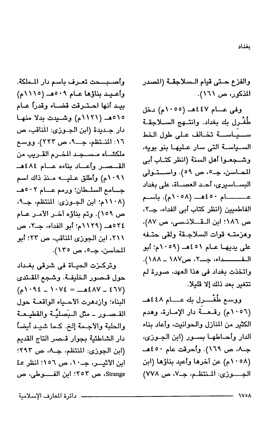 وفي عام 447 هـ (1055 م) دخل طُغْرِل بك بغداد. وانتهج السلاجقة السيَاسة تخالف على طول الخط السياسة التي سار عليها بنو بويه، وشجعوا أهل السنة (انظر كتاب أبي المحاسن، جـ 5، ص 59). واستولى البساسيرى، أحد العصاة، على بغداد عام 450 هـ (1058 م). باسم الفاطميين (انظر كتاب أبي الفداء، جـ 2، ص 186؛ ابن القلانسى، ص 87)، وهزمته قوات السلاجقة ولقى حتفه على يديها عام 451 هـ (1059 م؛ أبو الفداء، جـ 2، ص 187 - 188). واتخذت بغداد في هذا العهد، صورة لم تتغير بعد ذلك إلا قليلا.