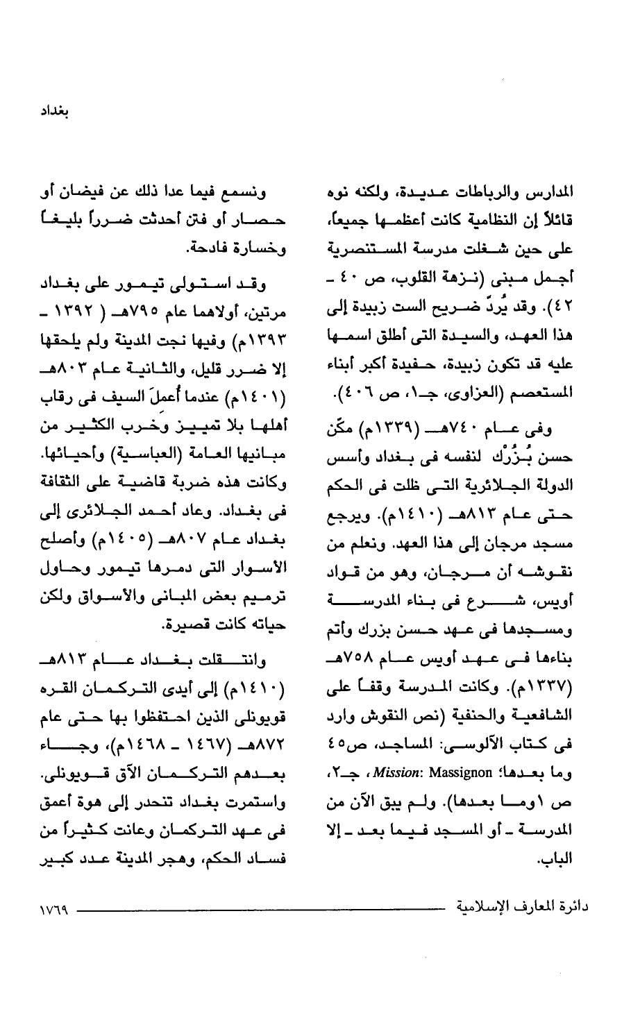 وقد استولى تيمور على بغداد مرتين، أولاهما عام 795 هـ (1392 - 1393 م) وفيها نجت المدينة ولم يلحقها إلا ضرر قليل، والثانية عام 803 هـ (1401 م) عندما أُعمِلَ السيف في رقاب أهلها بلا تمييز وخرب الكثير من مبانيها العامة (العباسية) وأحيائها. وكانت هذه ضربة قاضية على الثقافة في بغداد. وعاد أحمد الجلائرى إلى بغداد عام 807 هـ (1405) وأصلح الأسوار التي دمرها تيمور وحاول ترميم بعض المبانى والأسواق ولكن حياته كانت قصيرة.