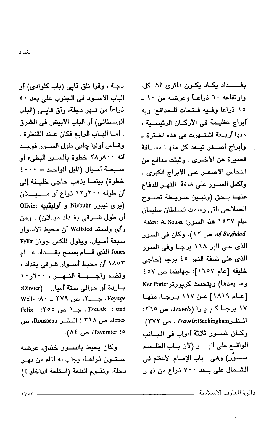 بغداد يكاد يكون دائرى الشكل، وارتفاعه 60 ذراعًا وعرضه من 10 - 15 ذراعا وفيه فتحات للمدافع؛ وبه أبراج عظيمة في الأركان الرئيسية، منها أربعة اشتهرت في هذه الفترة - وأبراج أصغر تبعد كل منها مسافة قصيرة عن الأخرى. وثبتت مدافع من النحاس الأصفر على الأبراج الكبرى. وأكمل السور على ضفة النهر للدفاع عنها بحق (وتبين خريطة نصوح الصلاحى التي رسمت للسلطان سليمان عام 1537 هذا السور؛ Atlas: Asousa of Baghdad، ص 12). وكان في السور الذي على البر 118 برجا وفي السور الذي على ضفة النهر 45 برجا (حاجى خليفه [عام 1657]: جهاننما ص 457 وما بعدها) ويتحدث كربورتر Ker Porter [عام 1819] عن برجا، منها 17 برجا كبيرا (Travels ص 265؛ انظر Travels: Buckingham، ص 372). وكان للسور ثلاثة أبواب في الجانب الواقع على البر (لأن باب الطلسم مسوَّر) وهي: باب الإمام الأعظم في الشمال على بعد 700 ذراع من نهر دجلة، وقرا نلق قابى (باب كلوادى) أو الباب الأسود في الجنوب على بعد 50 ذراعًا من نهر دجلة، وآق قابى (الباب الوسطانى) أو الباب الأبيض في الشرق. أما الباب الرابع فكان عند القنطرة. وقاس أوليا جلبى طول السور فوجد أنهِ 800 ر 28 خطوة بالسير البطئ أو سبعة أميال (الميل الواحد = 4000 خطوة) بينما يذهب حاجى خليفة إلى أن طوله 200 ر 12 ذراع أو ميلان (يرى نيبور Niebuhr وأوليفييه Olivier أن طول شرقي بغداد ميلان). ومن رأى ولستد Wellsted أن محيط الأسوار سبعة أميال. ويقول فلكس جونز Felix Jones الذي قام بمسح بغداد عام 1853 أن محيط أسوار شرقي بغداد، وتضم واجهة النهر، 10.600 ياردة أو حوالي ستة أميال (Olivier: Voyage، جـ 2، ص 379 - 80؛ - Well Travels: sted جـ 1 ص 255؛ Felix Jones ص 318؛ انظر Rousseau، ص 1 Tavemier ص 84). وكان يحيط بالسور خندق، عرضه ستون ذراعًا، يجلب له الماء من نهر دجلة. وتقوم القلعة (القلعة الداخلية)
