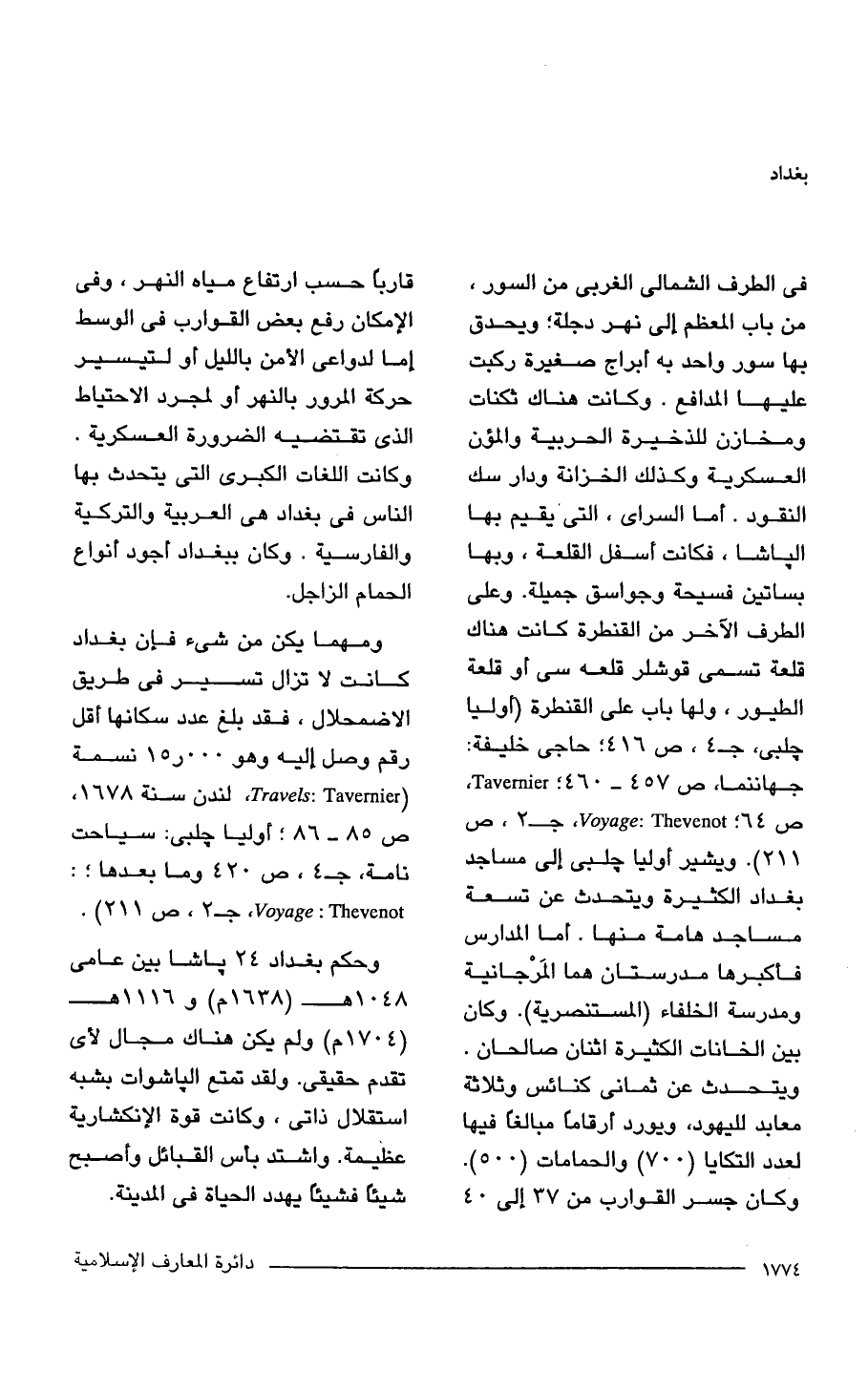 في الطرف الشمالي الغربي من السور، من باب المعظم إلى نهر دجلة؛ ويحدق بها سور واحد به أبراج صغيرة ركبت عليها المدافع. وكانت هناك ثكنات ومخازن للذخيرة الحربية والمؤن العسكرية وكذلك الخزانة ودار سك النقود. أما السراى، التي يقيم بها الباشا، فكانت أسفل القلعة، وبها بساتين فسيحة وجواسق جميلة. وعلى الطرف الآخر من القنطرة كانت هناك قلعة تسمى قوشلر قلعه سى أو قلعة الطيور، ولها باب على القنطرة (أوليا جلبى، جـ 4، ص 416؛ حاجى خليفة: جهاننما، ص 457 - 460؛ Tavernier ص 64؛ : Thevenot Voyage جـ 2 ص 211). ويشير أوليا جلبى إلى مساجد بغداد الكثيرة ويتحدث عن تسعة مساجد هامة منها. أما المدارس فأكبرها مدرستان هما المَرْجانية ومدرسة الخلفاء (المستنصرية). وكان بين الخانات الكثيرة اثنان صالحان. ويتحدث عن ثماني كنائس وثلاثة معابد لليهود، ويورد أرقامًا مبالغًا فيها لعدد التكايا (700) والحمامات (500). وكان جسر القوارب من 37 إلى 40 قاربًا حسب ارتفاع مياه النهر، وفي الإمكان رفع بعض القوارب في الوسط إما لدواعى الأمن بالليل أو لتيسير حركة المرور بالنهر أولمجرد الاحتياط الذي تقتضيه الضرورة العسكرية. وكانت اللغات الكبرى التي يتحدث بها الناس في بغداد هي العربية والتركية والفارسية. وكان ببغداد أجود أنواع الحمام الزاجل.