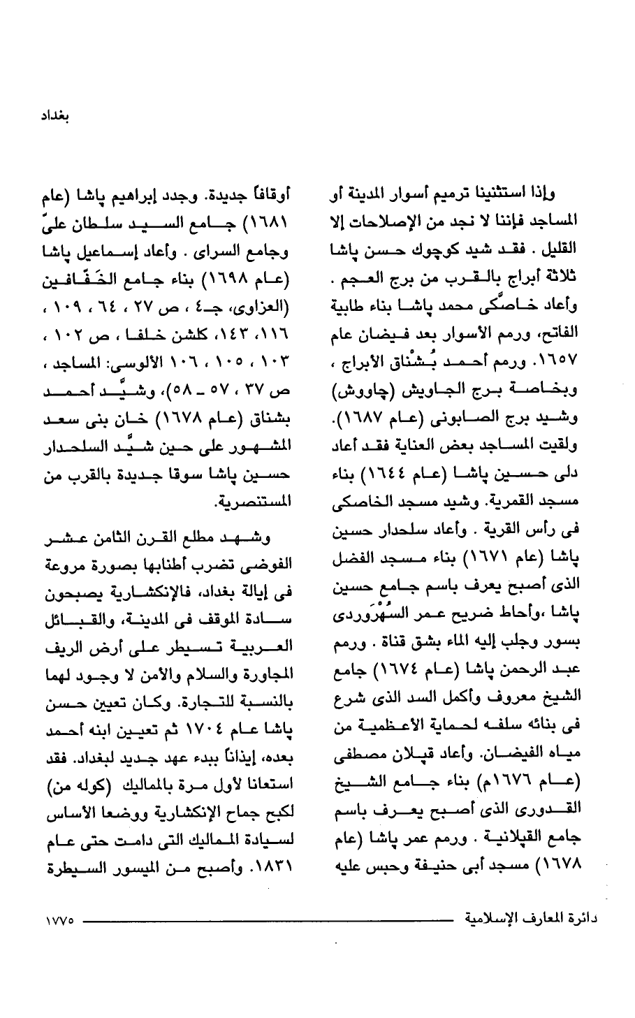 وإذا استثنينا ترميم أسوار المدينة أو المساجد فإننا لا نجد من الإصلاحات إلا القليل. فقد شيد كوجوك حسن باشا ثلاثة أبراج بالقرب من برج العجم. وأعاد خاصَّكى محمد باشا بناء طابية الفاتح، ورمم الأسوار بعد فيضان عام 1657. ورمم أحمد بُشْناق الأبراج، وبخاصة برج الجاويش (جاووش) وشيد برج الصابونى (عام 1687). ولقيت المساجد بعض العناية فقد أعاد دلى حسين باشا (عام 1644) بناء مسجد القمرية. وشيد مسجد الخاصكى في رأس القرية. وأعاد سلحدار حسين باشا (عام 1671) بناء مسجد الفضل الذي أصبخ يعرف باسم جامع حسين باشا، وأحاط ضريح عمر السُهْرَوردى بسور وجلب إليه الماء بشق قناة. ورمم عبد الرحمن باشا (عام 1674) جامع الشيخ معروف وأكمل السد الذي شرع في بنائه سلفه لحماية الأعظمية من مياه الفيضان. وأعاد قبلان مصطفى (عام 1676 م) بناء جامع الشيخ القدورى الذي أصبح يعرف باسم جامع القبلانية. ورمم عمر ياشا (عام (1678) مسجد أبي حنيفة وحبس عليه أوقافًا جديدة. وجدد إبراهيم باشا (عام 1681) جامع السيد سلطان على وجامع السراى. وأعاد إسماعيل ياشا (عام 1698) بناء جامع الخَفَافين (العزاوى، جـ 4، ص 27، 64، 109، 116، 143، كلشن خلفا، ص 102، 103، 106.105 الألو سى: المساجد، ص 37، 57 - 58)، وشيَّد أحمد بشناق (عام 1678) خان بنى سعد المشهور على حين شيَّد السلحدار حسين باشا سوقا جديدة بالقرب من المستنصرية.