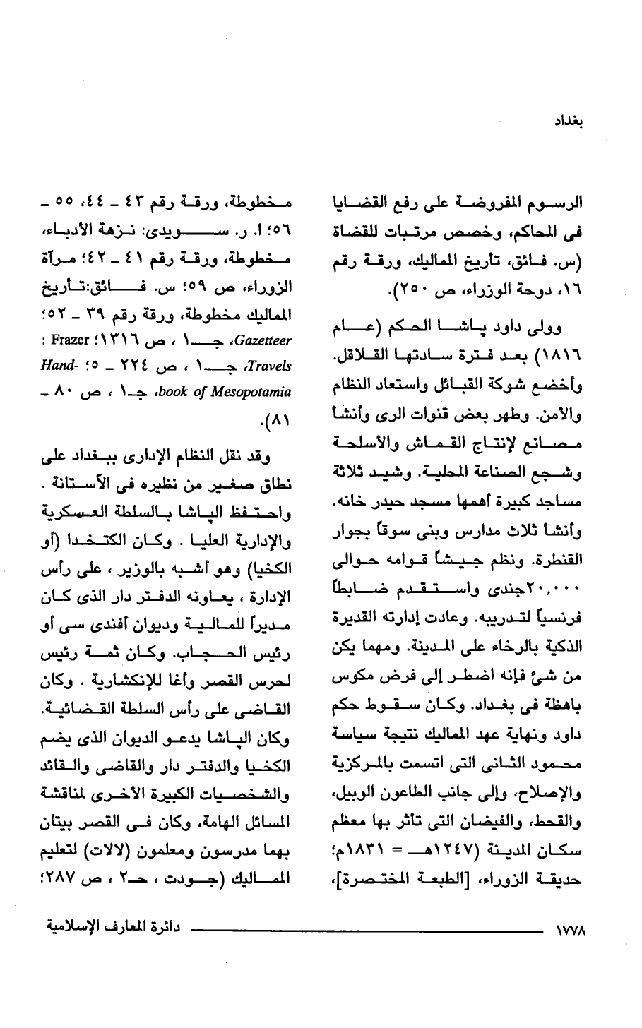 وولى داود باشا الحكم (عام 1816) بعد فترة سادتها القلاقل. وأخضع شوكة القبائل واستعاد النظام والأمن. وطهر بعض قنوات الري وأنشأ مصانع لانتاج القماش والأسلحة وشجع الصناعة المحلية. وشيد ثلاثة مساجد كبيرة أهمها مسجد حيدر خانه. وأنشا ثلاث مدارس وبنى سوقًا بجوار القنطرة. ونظم جيشا قوامه حوالي 000 ر 20 جندى واستقدم ضابطًا فرنسيًا لتدريبه. وعادت إدارته القديرة الذكية بالرخاء على المدينة. ومهما يكن من شيء فإنه اضطر إلى فرض مكوس باهظة في بغداد. وكان سقوط حكم داود ونهاية عهد المماليك نتيجة سياسة محمود الثاني التي اتسمت بالمركزية والإصلاح، وإلى جانب الطاعون الوبيل، والقحط، والفيضان التي تأثر بها معظم سكان المدينة (1247 هـ = 1831 م؛ حديقة الزوراء، [الطبعة المختصرة]، مخطوطة، ورقة رقم 43 - 44، 55 - 56؛ ا. ر. سويدى: نزهة الأدباء، مخطوطة، ورقة رقم 41 - 42؛ مرآة الزوراء، ص 59؛ س. فائق: تأريخ المماليك مخطوطة، ورقة رقم 39 - 52؛ Gazetteer جـ 1، ص 1316 Frazer: TraveLs، جـ 1، ص 224 - 5؛ Hand book of Mesopotamia, جـ 1، ص 80 - 81).
