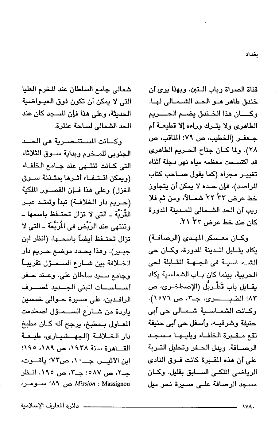 قناة الصراة وباب التبن، وبهذا يرى أن خندق طاهر هو الحد الشمالي لها. وكان هذا الخندق يضم الحريم الطاهرى ولا يترك وراءه إلا قطيعة أم جعفر (الخطيب، ص 79؛ المناقب، ص 28). ولما كان جناح الحريم الطاهرى قد اكتسحت معظمه مياه نهر دجلة أثناء تغيير مجراه (كما يقول صاحب كتاب المراصد)، فإن حده لا يمكن أن يتجاوز خط عرض 33 ْ 22 َ شمالًا، ومن ثم فلا ريب أن الحد الشمالي للمدينة المدورة كان عند خط عرض 33 ْ 21 َ.