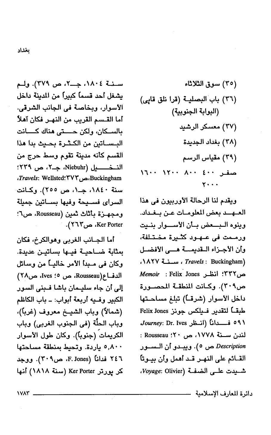 ويقدم لنا الرحالة الأوربيون في هذا العهد بعض المعلومات عن بغداد. وينوه البعض بأن الأسوار بنيت ورممت في عهود كثيرة مختلفة، وأن الأجزاء القديمة هي الأفضل (Travels: Buckingham , سنة 1827، ص 332؛ انظر Memoir: Felix Jones ص 309). وكانت المنطقة المحصورة داخل الأسوار (شرقًا) تبلغ مساحتها طبقًا لتقدير فيلكس جونز Felix Jones 591 فدانًا (انظر Journey: Dr. Lves لندن سنة 1778، ص 20؛ Rousseau: Description ص 5). ويبدو أن السور القائم على النهر قد أهمل وأن بيوتًا شيدت على الضفة (Voyage: Olivier، سنة 1804، جـ 2، ص 379). ولم يشغل أحد قسمًا كبيرًا من المدينة داخل الأسوار، وبخاصة في الجانب الشرقي. أما القسم القريب من النهر فكان آهلًا بالسكان، ولكن حتى هناك كانت البساتين من الكثرة بحيث بدا هذا القسم كأنه مدينة تقوم وسط حرج من النخيل (Niebuhr، جـ 2، ص 239؛ Buckingham، ص 373؛ Wellsted: Travels, سنة. 1840، جـ 1، ص 255). وكانت السراى فسيحة وفيها بساتين جميلة ومجهزة بأثاث ثمين (Rousseau، ص 6؛ Ker Porter، ص 263).