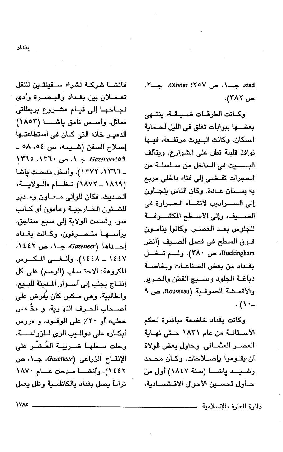 وكانت بغداد خاضعة مباشرة لحكم الآستانة من عام 1831 حتى نهاية العصر العثمانى. وحاول بعض الولاة أن يقوموا بإصلاحات. وكان محمد رشيد ياشا (سنة 1847) أول من حاول تحسين الأحوال الاقتصادية، فأنشأ شركة لشراء سفينتين للنقل تعملان بين بغداد والبصرة وأدى نجاحها إلى قيام مشروع بريطانى مماثل. وأسس نامق باشا (1853) الدمير خانه التي كان في استطاعتها إصلاح السفن (شيحه، ص 54، 58 - 59؛ Gazetteer, جـ 1، ص 1360، 1365 - 1366، 1372). وأدخل مدحت باشا (1869 - 1872) نظام "الولاية" الحديث. فكان للوالى معاون ومدير للشئون الخارجية ومأمون أو كاتب سر. وقسمت الولاية إلى سبع سناجق، يرأسها متصرفون، وكانت بغداد إحداها (Gazetteer، جـ 1، ص 1442، 1447 - 1448). وألغى المكوس المكروهة: الاحتساب (الرسم) على كل إنتاج يجلب إلى أسوار المدينة للبيع، والطالبية، وهي مكس كان يُفرض على أصحاب الحرف النهرية، و"خُمس حطب" أو 20 % على الوقود، و"روس أبكار" على دواليب الري للزراعة، وحلت محلها ضريبة العُشْر على الإنتاج الزراعى (Gazetteer, جـ 1، ص 1442) وأنشأ مدحت عام 1870 ترامًا يصل بغداد بالكاظمية وظل يعمل