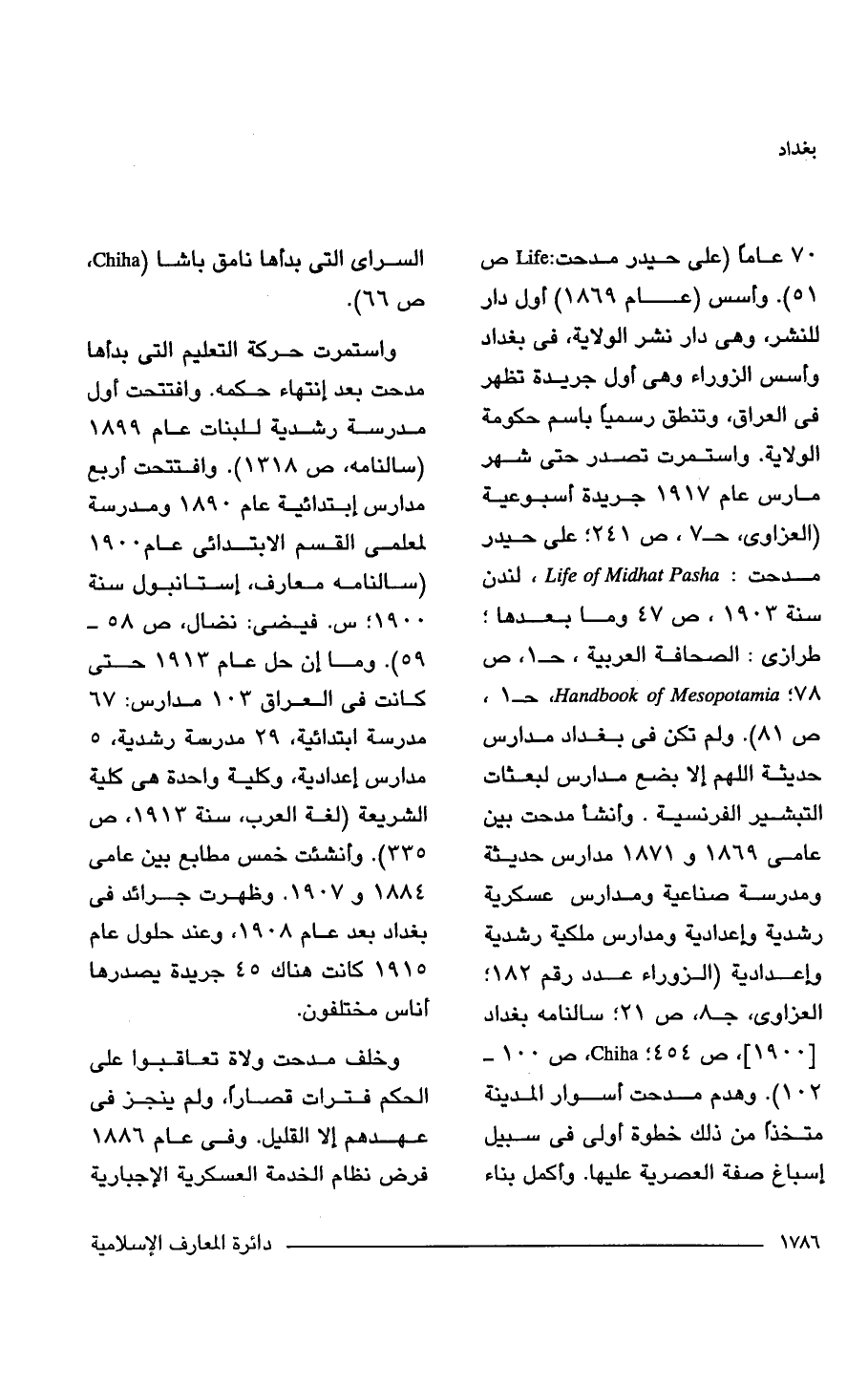 70 عاما (على حيدر مدحت: Life ص 51). وأسس (عام 1869) أول دار للنشر، وهي دار نشر الولاية، في بغداد وأسس الزوراء وهي أول جريدة تظهر في العراق، وتنطق رسميًا باسم حكومة الولاية. واستمرت تصدر حتى شهر مارس عام م 1917 جريدة أسبوعية (العزاوى، حـ 7، ص 241؛ على حيدر مدحت: Life of Midhat Pasha، لندن سنة 1903، ص 47 وما بعدها؛ طرازى: الصحافة العربية، حـ 1، ص 78؛ Handbook of Mesopotamia، حـ 1 ص 81). ولم تكن في بغداد مدارس حديثة اللهم إلا بضع مدارس لبعثات التبشير الفرنسية. وأنشأ مدحت بين عامي 1869 و 1871 مدارس حديثة ومدرسة صناعية ومدارس عسكرية رشدية وإعدادية ومدارس ملكية رشدية وإعدادية (الزوراء عدد رقم 182؛ العزاوى، جـ 8، ص 21؛ سالنامه بغداد [1900]، ص 454؛ Chiha، ص 100 - 102). وهدم مدحت أسوار المدينة متخذًا من ذلك خطوة أولى في سبيل إسباغ صفة العصرية عليها. وأكمل بناء السراى التي بدأها نامق باشا) Chiha, ص 66).
