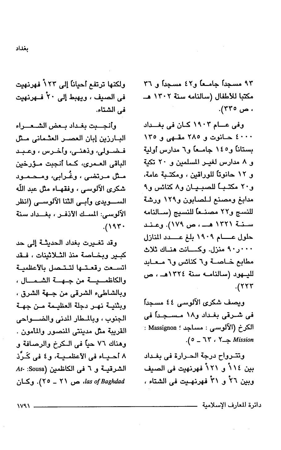 ويصف شكرى الآلوسى 44 مسجدًا في شرقي بغداد و 18 مسجدًا في الكرخ (الآلوسى: مساجد؛ Massignon: Mission جـ 2، 63 - 5).