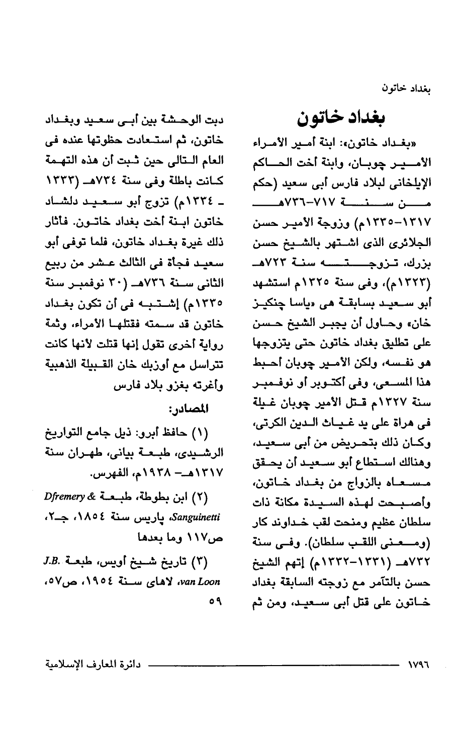 " بغداد خاتون": ابنة أمير الأهراء الأمير جوبان، وابنة أخت الحاكم الأيلخانى لبلاد فارس أبي سعيد (حكم من سنة 717 - 736 هـ 1317 - 1335 م) وزوجة الأمير حسن الجلائرى الذي اشتهر بالشيخ حسن بزرك، تزوجته سنة 723 هـ (1323 م)، وفي سنة 1325 م استشهد أبو سعيد بسابقة هي "ياسا جنكيز خان" وحاول أن يجبر الشيخ حسن على تطليق بغداد خاتون حتى يتزوجها هو نفسه، ولكن الأمير جوبان أحبط هذا المسعى، وفي أكتوبر أو نوفمبر سنة 1327 م قتل الأمير جوبان غيلة في هراة على يد غياث الدين الكرتى، وكان ذلك بتحريض من أبي سعيد، وهنالك استطاع أبو سعيد أن يحقق مسعاه بالزواج من بغداد خاتون، وأصبحت لهذه السيدة مكانة ذات سلطان عظيم ومنحت لقب خداوند كار (ومعنى اللقب سلطان). وفي سنة 732 هـ (1331 - 1332 م) اتهم الشيخ حسن بالتآمر مع زوجته السابقة بغداد خاتون على قتل أبي سعيد، ومن ثم دبت الوحشة بين أبي سعيد وبغداد خاتون، ثم استعادت حظوتها عنده في العام التالي حين ثبت أن هذه التهمة كانت باطلة وفي سنة 734 هـ (1333 - 1334 م) تزوج أبو سعيد دلشاد خاتون ابنة أخت بغداد خاتون. فأثار ذلك غيرة بغداد خاتون، فلما توفى أبو سعيد فجأة في الثالث عشر من ربيع الثاني سنة 736 هـ (30 نوفمبر سنة 1335 م) إشتبه في أن تكون بغداد خاتون قد سمته فقتلها الأمراء، وثمة رواية أخرى تقول إنها قتلت لأنها كانت تتراسل مع أوزبك خان القبيلة الذهبية وأغرته بغزو بلاد فارس.