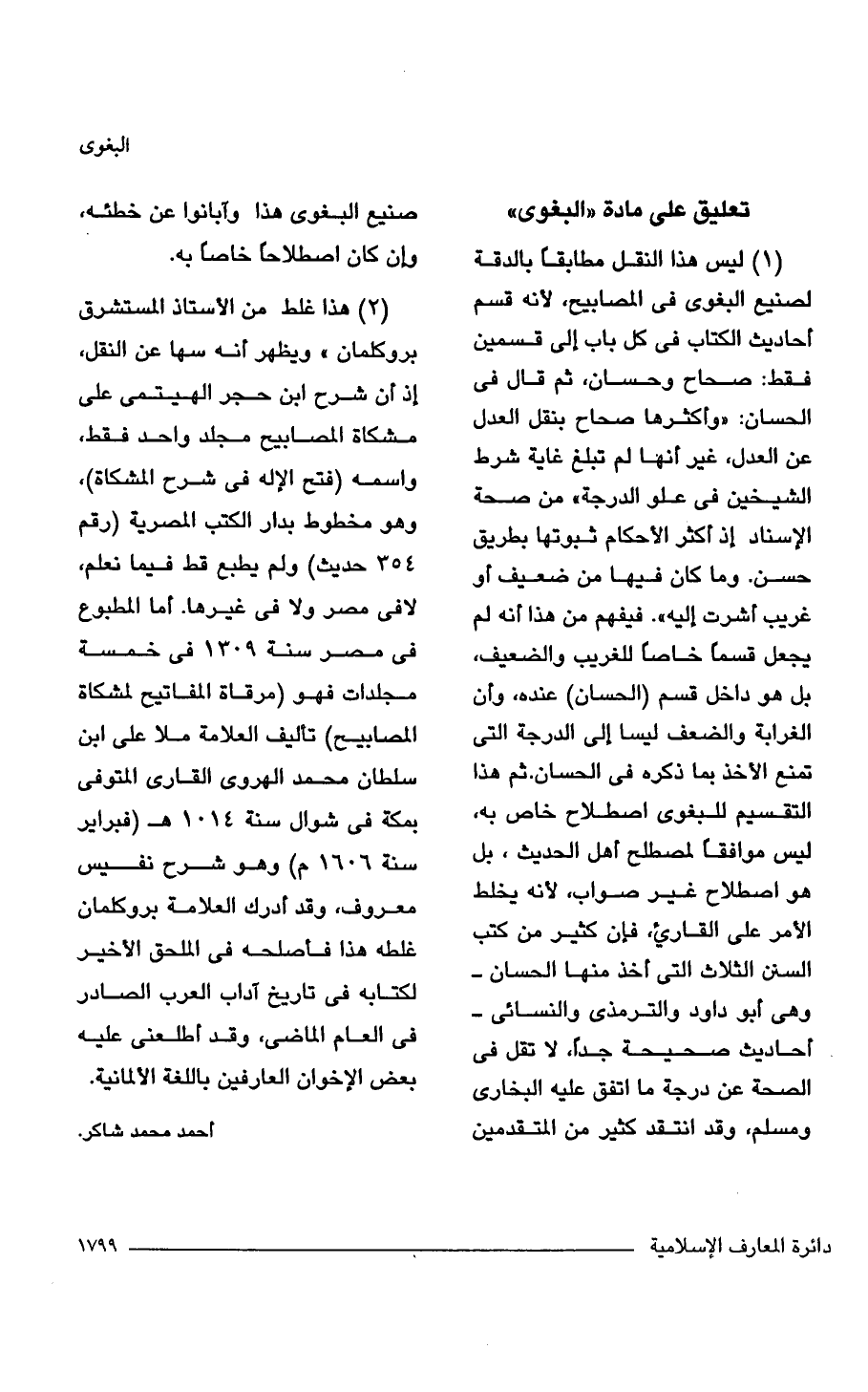 (2) هذا غلط من الأستاذ المستشرق بروكلمان" ويظهر أنه سها عن النقل، إذ أن شرح ابن حجر الهيتمى على مشكاة المصابيح مجلد واحد فقط، واسمه (فتح الإله في شرح المشكاة)، وهو مخطوط بدار الكتب المصرية (رقم 354 حديث) ولم يطبع قط فيما نعلم، لا في مصر ولا في غيرها. أما المطبوع في مصر سنة 1309 في خمسة مجلدات فهو (مرقاة المفاتيح لمشكاة المصابيح) تأليف العلامة ملا على ابن سلطان محمد الهروى القارى المتوفى بمكة في شوال سنة 1014 هـ (فبراير سنة 1606 م) وهو شرح نفيس معروف، وقد أدرك العلامة بروكلمان غلطه هذا فأصلحه في الملحق الأخير لكتابه في تاريخ آداب العرب الصادر في العام الماضي، وقد أطلعنى عليه بعض الإخوان العارفين باللغة الألمانية.