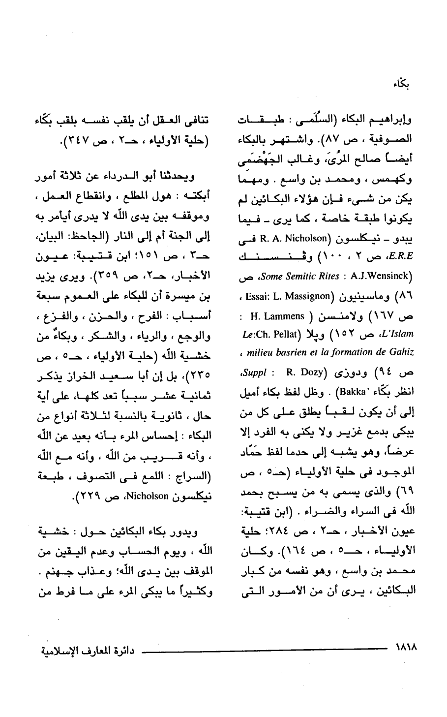 وإبراهيم البكاء (السُلَمى: طبقات الصوفية، ص 87). واشتهر بالبكاء أيضًا صالح المرُىَ، وغالب الجَهْضَمى وكهمس، ومحمد بن واسع. ومهَما يكن من شيء فإن هؤلاء البكائين لم يكونوا طبقة خاصة، كما يرى- فيما يبدو- نيكلسون) (R. A. Nicholson في E.R.E. ص 100، 2) وفنسنك (Some Semitic Rites: A.J.Wensinckl 86) وماسينيون ص 86) وماسينيون (Essai: L.Massignon): ص 167) ولامنسن milieu basrien et la formation de Gahiz . ص 94) ودوزى R.Dozy): Suppl انظر بكاء Bakka) . وظل لفظ بكاء أميل إلى أن يكون لقبًا يطلق على كل من يبكى بدمع غزير ولا يكنى به الفرد إلا عرضًا، وهو يشبه إلى حدما لفظ حَمّاد الموجود في حلية الأولياء (جـ 5، ص 69) والذي يسمى به من يسبح بحمد الله في السراء والضراء. (ابن قتيبة: عيون الأخبار، حـ 2، ص 284؛ حلية الأولياء، حـ 5، ص 164). وكان محمد بن واسع، وهو نفسه من كبار البكائين، يرى أن من الأمور التي تنافى العقل أن يلقب نفسه بلقب بكَاء (حلية الأولياء، جـ 2، ص 347).