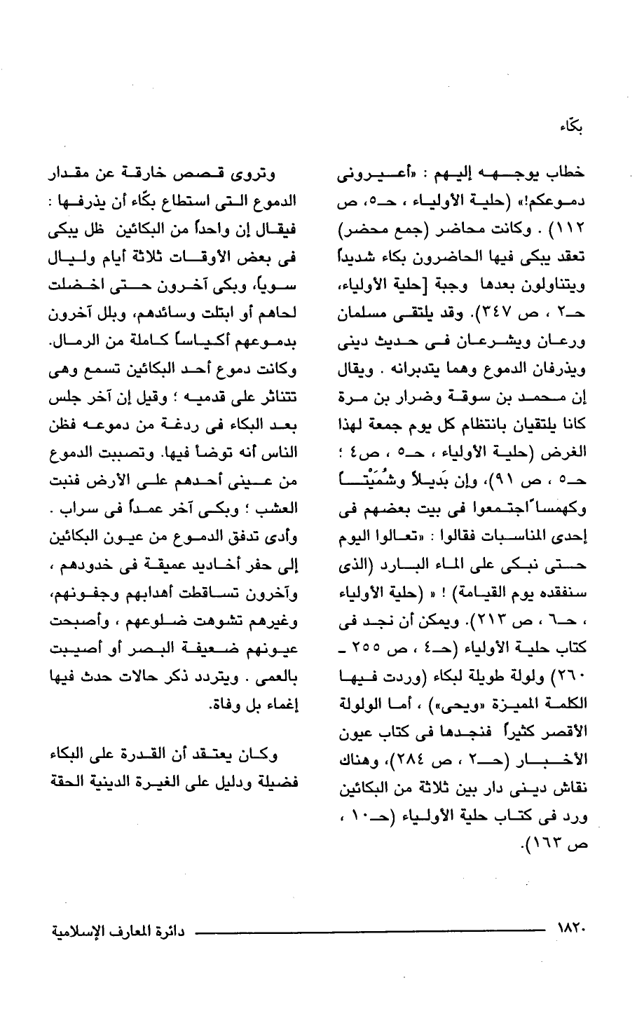 خطاب يوجهه إليهم: "أعيرونى دموعكم! " (حلية الأولياء، حـ 5، ص 112). وكانت محاضر (جمع محضر) تعقد يبكى فيها الحاضرون بكاء شديدًا ويتناولون بعدها وجبة [حلية الأولياء، حـ 2، ص 347). وقد يلتقى مسلمان ورعان ويشرعان في حديث دينى ويذرفان الدموع وهما يتدبرانه. ويقال إن محمد بن سوقة وضرار بن مرة كانا يلتقيان بانتظام كل يوم جمعة لهذا الغرض (حلية الأولياء، حـ 5، ص 4؛ حـ 5، ص 91)، وإن بَديلًا وشُمَيتًا وكهمسا اجتمعوا في بيت بعضهم في إحدى المناسبات فقالوا: "تعالوا اليوم حتى نبكى على الماء البارد (الذي سنفقده يوم القيامة)! " (حلية الأولياء حـ 6، ص 213). ويمكن أن نجد في كتاب حلية الأولياء (حـ 4، ص 255 - 260) ولولة طويلة لبكاء (وردت فيها الكلمة المميزة "ويحيى")، أما الولولة الأقصر كثيرًا فنجدها في كتاب عيون الأخبار (حـ 2، ص 284) , وهناك نقاش دينى دار بين ثلاثة من البكائين ورد في كتاب حلية الأولياء (حـ 10، ص 163).