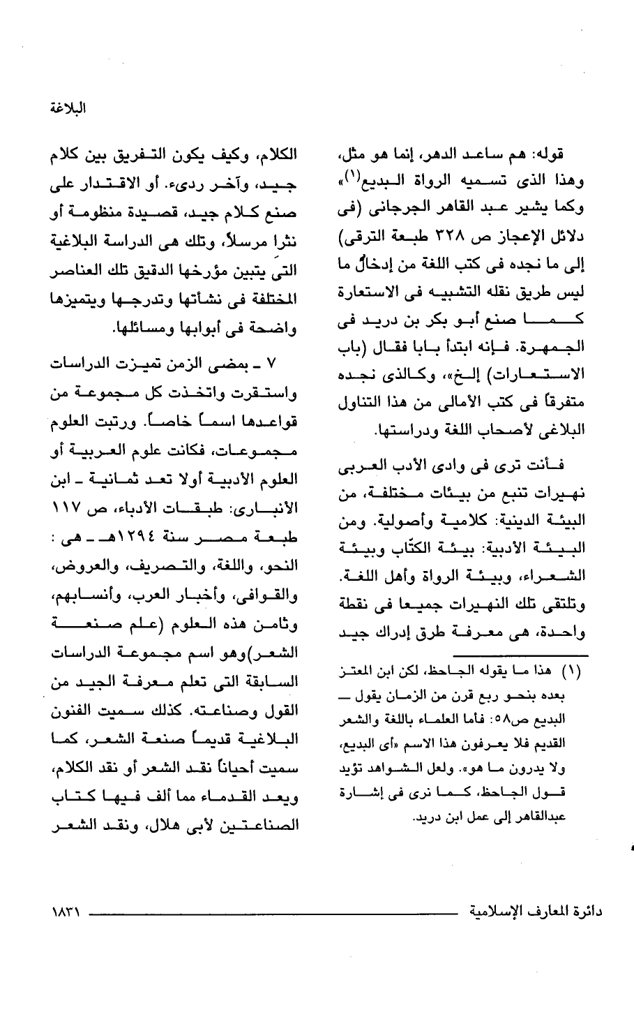(¬1) هذا ما يقوله الجاحظ، لكن ابن المعتز بعده بنحو ربع قرن من الزمان يقول- البديع ص 58: فأما العلماء باللغة والشعر القديم فلا يعرفون هذا الاسم "أي البديع، ولا يدرون ما هو". ولعل الشواهد تؤيد قول الجاحظ، كما نرى في إشارة عبد القاهر إلى عمل ابن دريد.