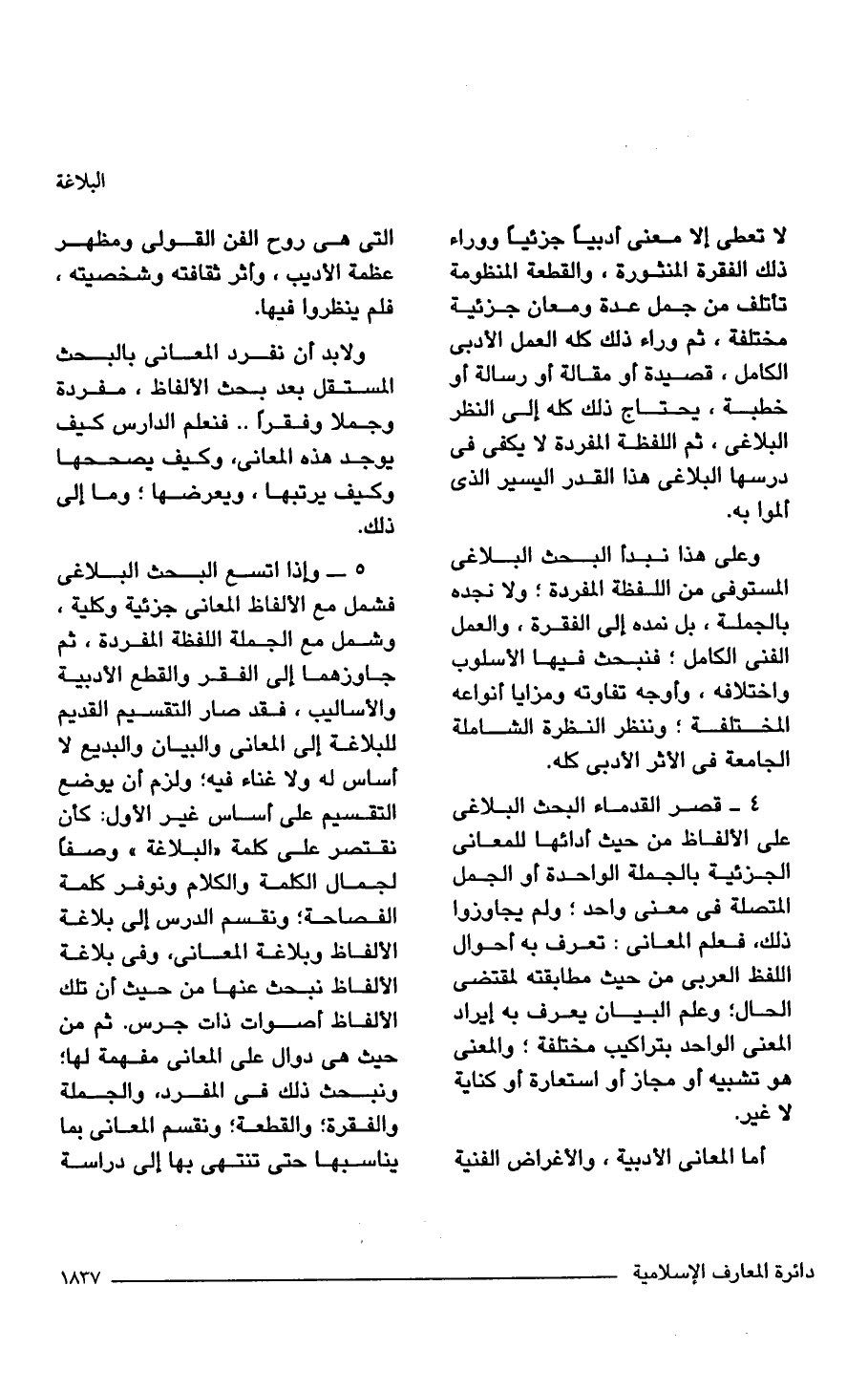 لا تعطى إلا معنى أدبيًا جزئيًا ووراء ذلك الفقرة المنثورة، والقطعة المنظومة تأتلف من جمل عدة ومعان جزئية مختلفة، ثم وراء ذلك كله العمل الأدبى الكامل، قصيدة أو مقالة أو رسالة أو خطبة، يحتاج ذلك كله إلى النظر البلاغى، ثم اللفظة المفردة لا يكفى في درسها البلاغى هذا القدر اليسير الذي ألموا به.