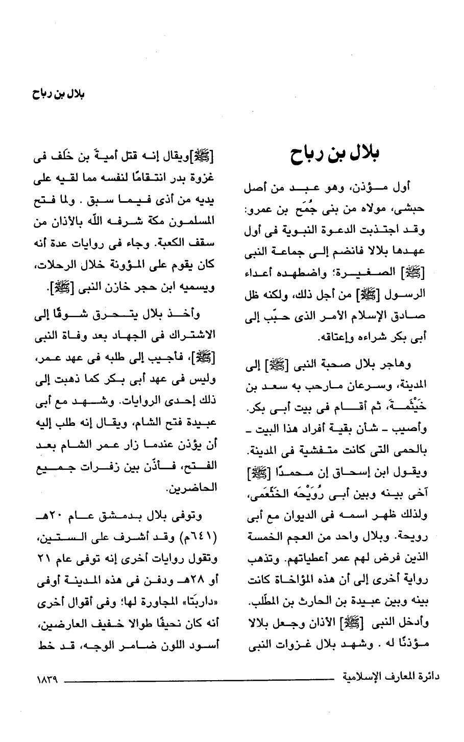 أول مؤذن، وهو عبد من أصل حبشى، مولاه من بنى جُمَح بن عمرو: وقد اجتذبت الدعوة النبوية في أول عهدها بلالا فانضم إلى جماعة النبي [- صلى الله عليه وسلم -] الصغيرة؛ واضطهده أعداء الرسول [- صلى الله عليه وسلم -] من أجل ذلك، ولكنه ظل صادق الإسلام الأمر الذي حبّب إلى أبي بكر شراءه وإعتاقه.