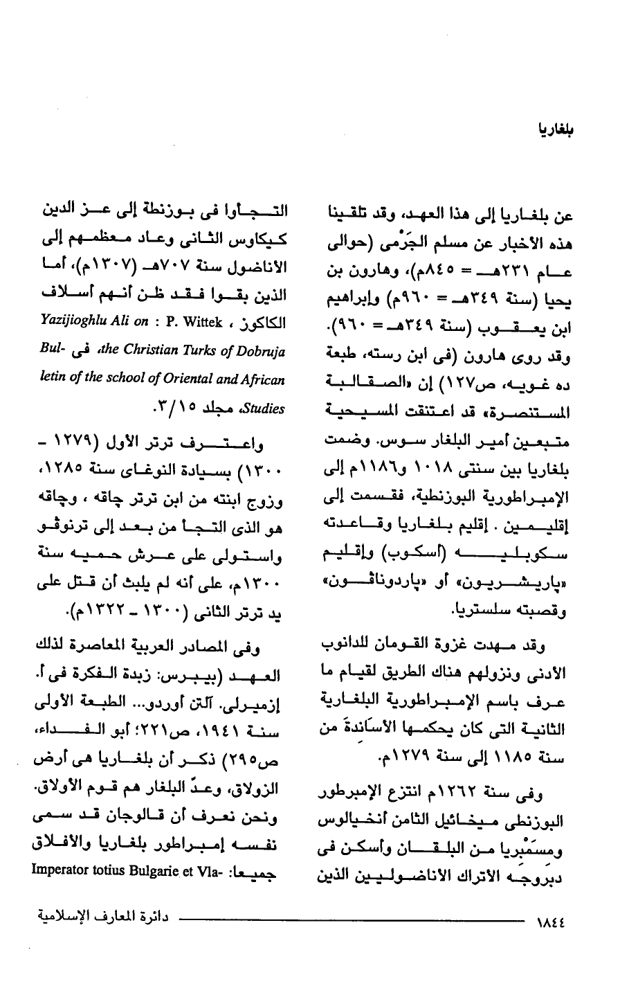عن بلغاريا إلى هذا العهد: وقد تلقينا هذه الأخبار عن مسلم الجَرمى (حوالي عام 231 هـ = 845 م)، وهارون بن يحيا (سنة 339 هـ = 960 م) وإبراهيم بن يعقوب (سنة 349 هـ = 960). وقد روى هارون (في ابن رسته، طبعة ده غويه، ص 127) إن "الصقالبة المستنصرة" قد اعتنقت المسيحية متبعين أمير البلغار سوس. وضمت بلغاريا بين سنتى 1018 و 1186 م إلى الإمبراطورية البوزنطية، فقسمت إلى إقليمين. إقليم بلغاريا وقاعدته سكوبليه (سكوب) وإقليم "ياريشريون" أو "باردونافون" وقصبته سلستريا.