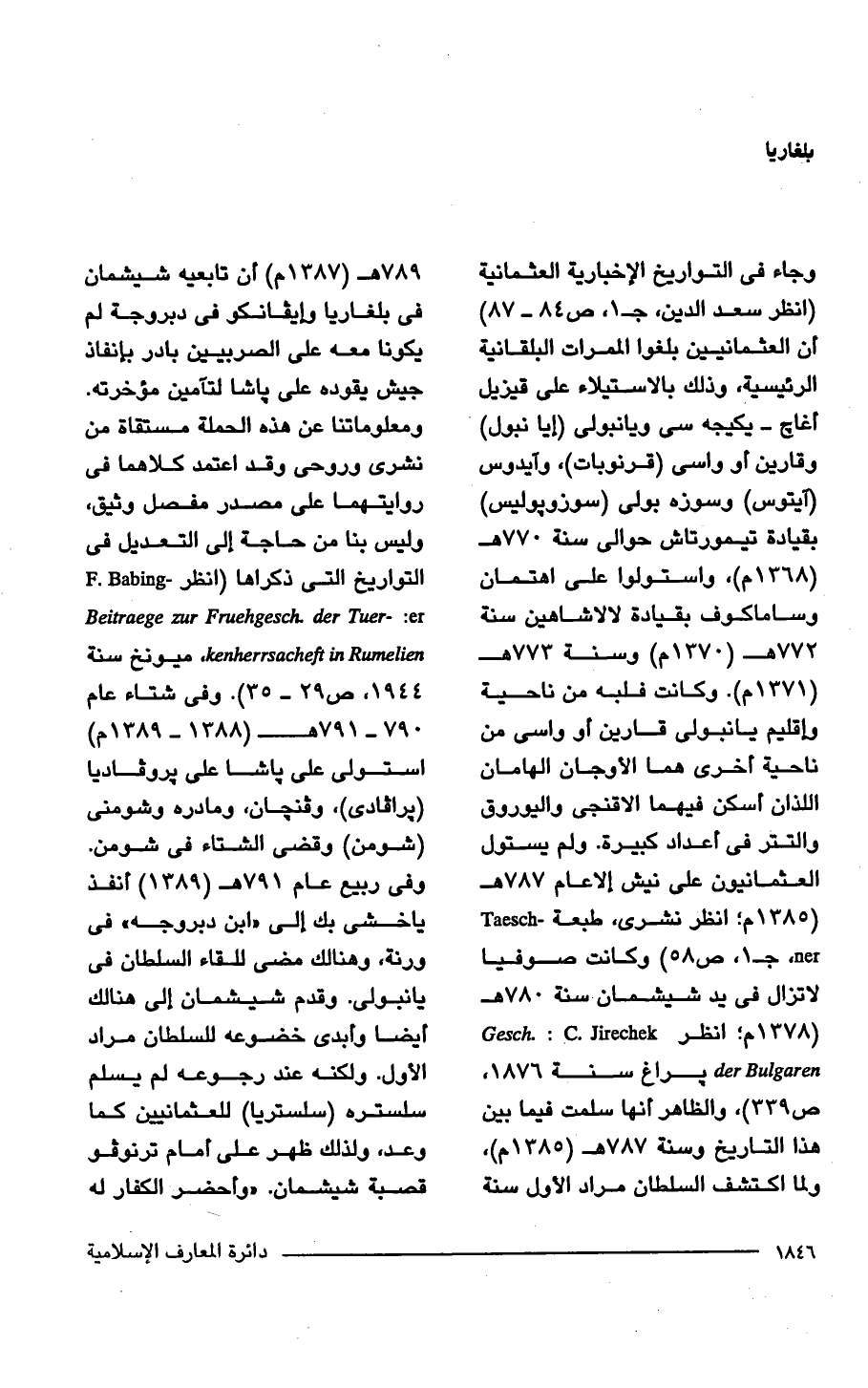 وجاء في التواريخ الإخبارية العثمانية (انظر سعد الدين، جـ 1، ص 84 - 87) أن العثمانيين بلغوا الممرات البلقانية الرئيسية، وذلك بالاستيلاء على قيزيل أغاج - يكيجه سى ويانبولى (إيا نبول) وقارين أو واسى (قرنوبات)، وآيدوس (آيتوس) وسوزه بولى (سوزوبوليس) بقيادة تيمورتاش حوالي سنة 770 هـ (1368 م)، واستولوا على اهتمان وساماكوف بقيادة لالاشاهين سنة 772 هـ (1370 م) وسنة 773 هـ (1371 م). وكانت فلبه من ناحية وإقليم يانبولى قارين أو واسى من ناحية أخرى هما الأوجان الهامان اللذان أسكن فيهما الاقنجى واليوروق والتتر في اعداد كبيرة. ولم يستول العثمانيون على نيش إلا عام 787 هـ (1385 م؛ انظر نشرى، طبعة taesch- ner , جـ 1, ص 58) وكانت صوفيا لا تزال في يد شيشمان سنة 780 هـ (1378 م؛ انظر Gesch.: C. Jirechek der Bulgaren براغ سنة 1876, ص 339) , والظاهر أنها سلمت فيما بين هذا التاريخ وسنة 787 هـ (1385 م)، ولما اكتشف السلطان مراد الأول سنة 789 هـ (1387 م) أن تابعيه شيشمان في بلغاريا وإيفانكو في دبروجة لم يكونا معه على الصربيين بادر بإنفاذ جيش يقوده على باشا لتأمين مؤخرته. ومعلوماتنا عن هذه الحملة مستقاة من نشرى وروحى وقد اعتمد كلاهما في روايتهما على مصدر مفصل وثيق، وليس بنا من حاجة إلى التعديل في التواريخ التي ذكراها (انظر - F. Babing Beitraege zur Fruehgesch. der Tuer-: et kenherracheftinmelien ميونخ سنة 1944, ص 29 - 35). وفي شتاء عام 790 - 791 هـ (1388 - 1389 م) استولى على باشا على بروفاديا (برافادى)، وفنجان، ومادره وشومنى (شومن) وقضى الشتاء في شومن. وفي ربيع عام 791 هـ (1389) أنفذ ياخشى بك إلى "ابن دبروجه" في ورنة، وهنالك مضى للقاء السلطان في يانبولى. وقدم شيشمان إلى هنالك أيضًا وأبدى خضوعه للسلطان مراد الأول. ولكنه عند رجوعه لم يسلم سلستره (سلستريا) للعثمانيين كما وعد، ولذلك ظهر على أمام ترنوفو قصبة شيشمان. "وأحضر الكفار له